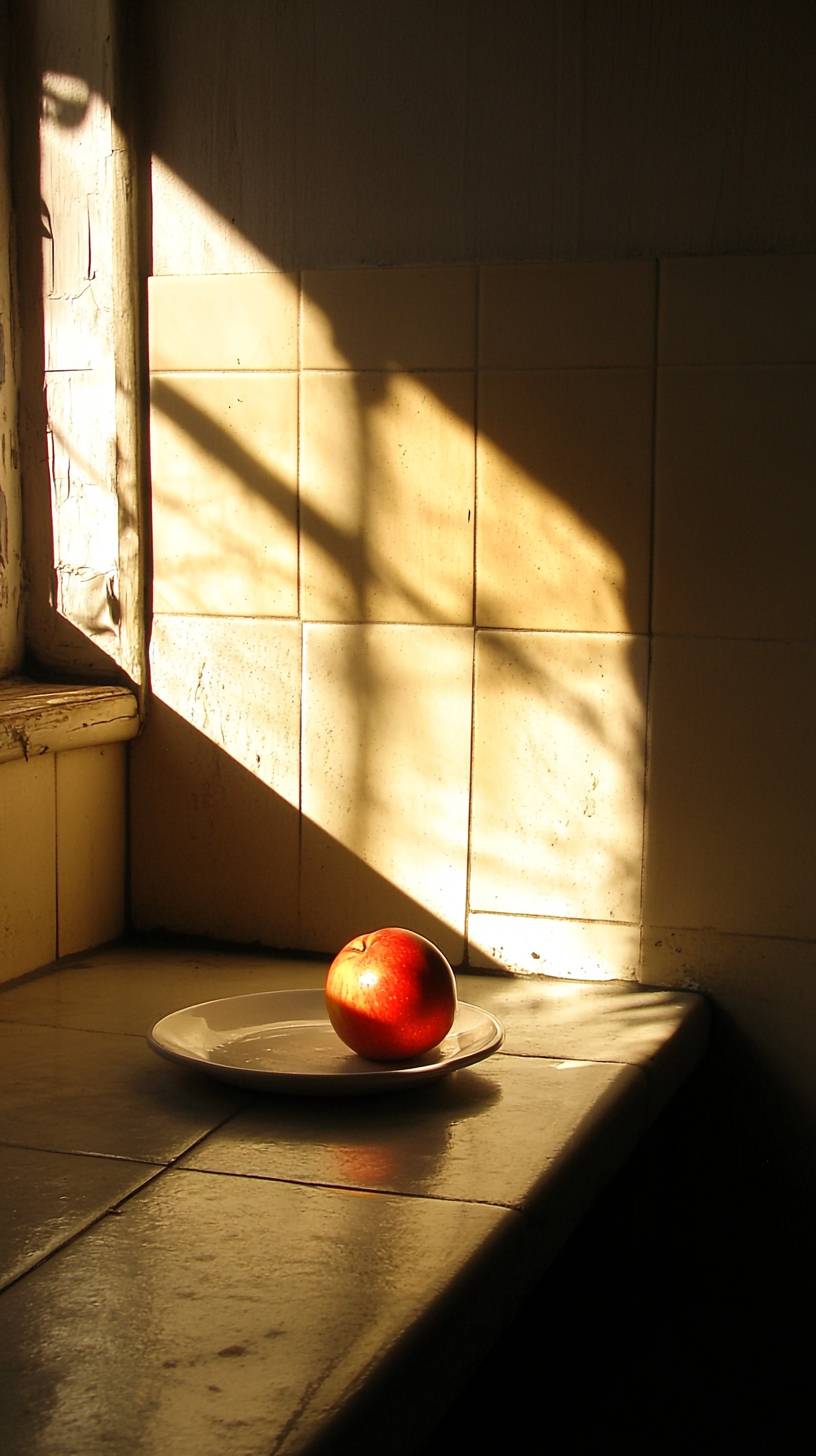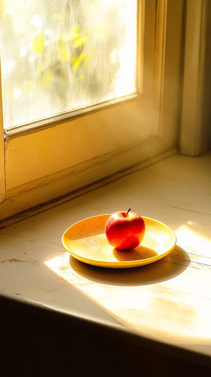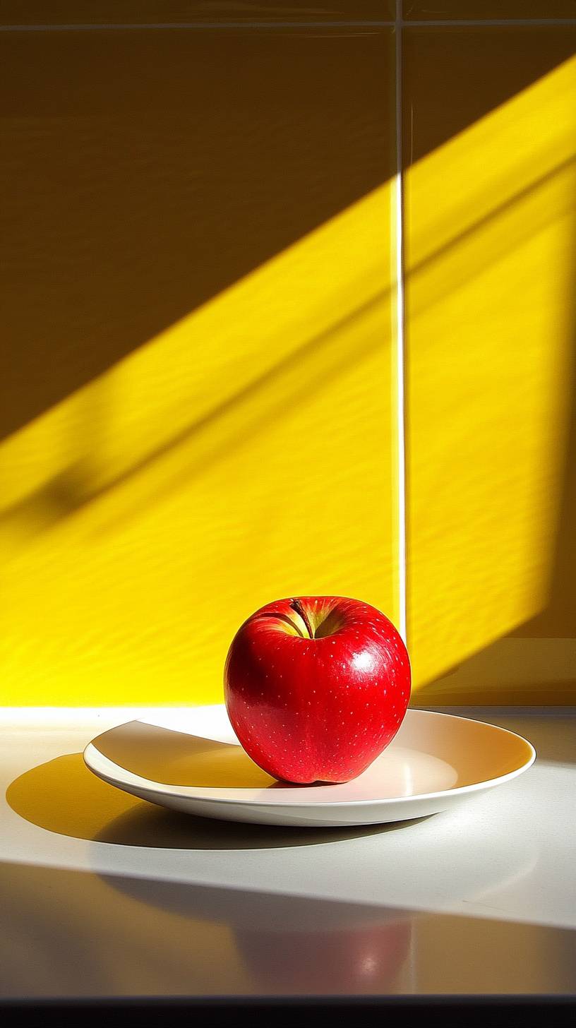 a photograph : A bright morning sunlight streams into the kitchen (in yellow, like pop-art), and a red apple sits on the plate. --ar 9:16 --v 6.1