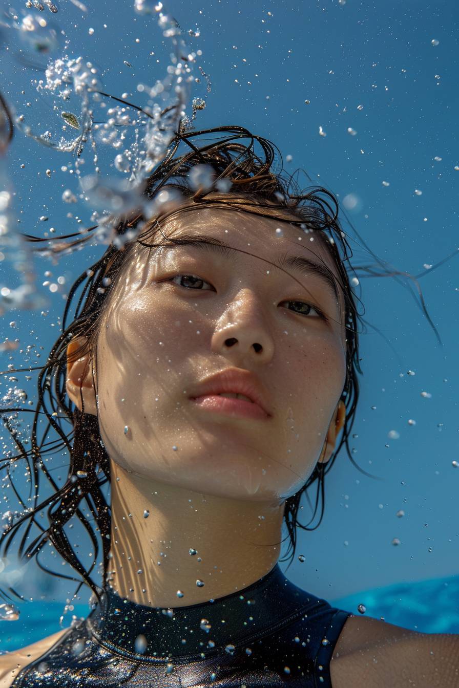 The image shows a young beautiful korea women in a rash guard, seemingly enjoying time in the water, perhaps during a sunny day given the blue skies and the reflection of the sun on the water’s surface. The person’s hair is wet and slicked back, suggesting that they may have been swimming or engaging in a water activity. The viewer’s perspective is from a low angle, looking up towards the person and the sky beyond. --ar 2:3 --style raw --v 6.0