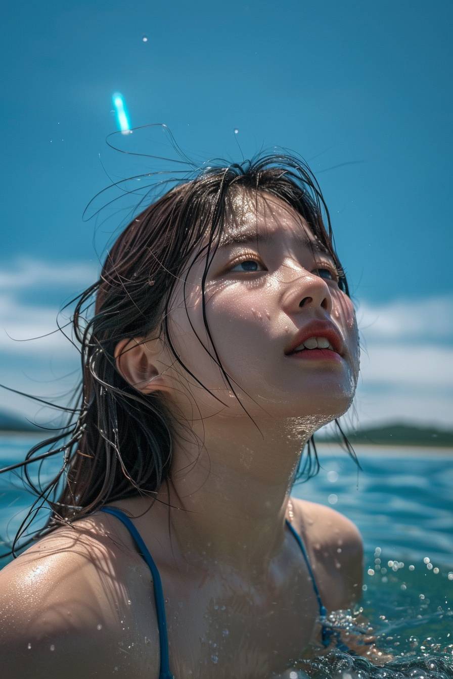 The image shows a young beautiful korea women in a rash guard, seemingly enjoying time in the water, perhaps during a sunny day given the blue skies and the reflection of the sun on the water’s surface. The person’s hair is wet and slicked back, suggesting that they may have been swimming or engaging in a water activity. The viewer’s perspective is from a low angle, looking up towards the person and the sky beyond. --ar 2:3 --style raw --v 6.0