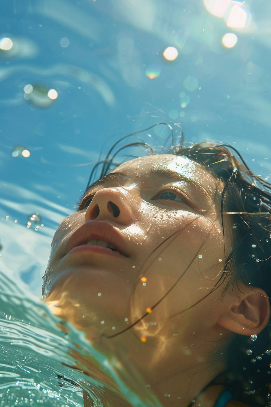 The image shows a young beautiful korea women in a rash guard, seemingly enjoying time in the water, perhaps during a sunny day given the blue skies and the reflection of the sun on the water’s surface. The person’s hair is wet and slicked back, suggesting that they may have been swimming or engaging in a water activity. The viewer’s perspective is from a low angle, looking up towards the person and the sky beyond. --ar 2:3 --style raw --v 6.0