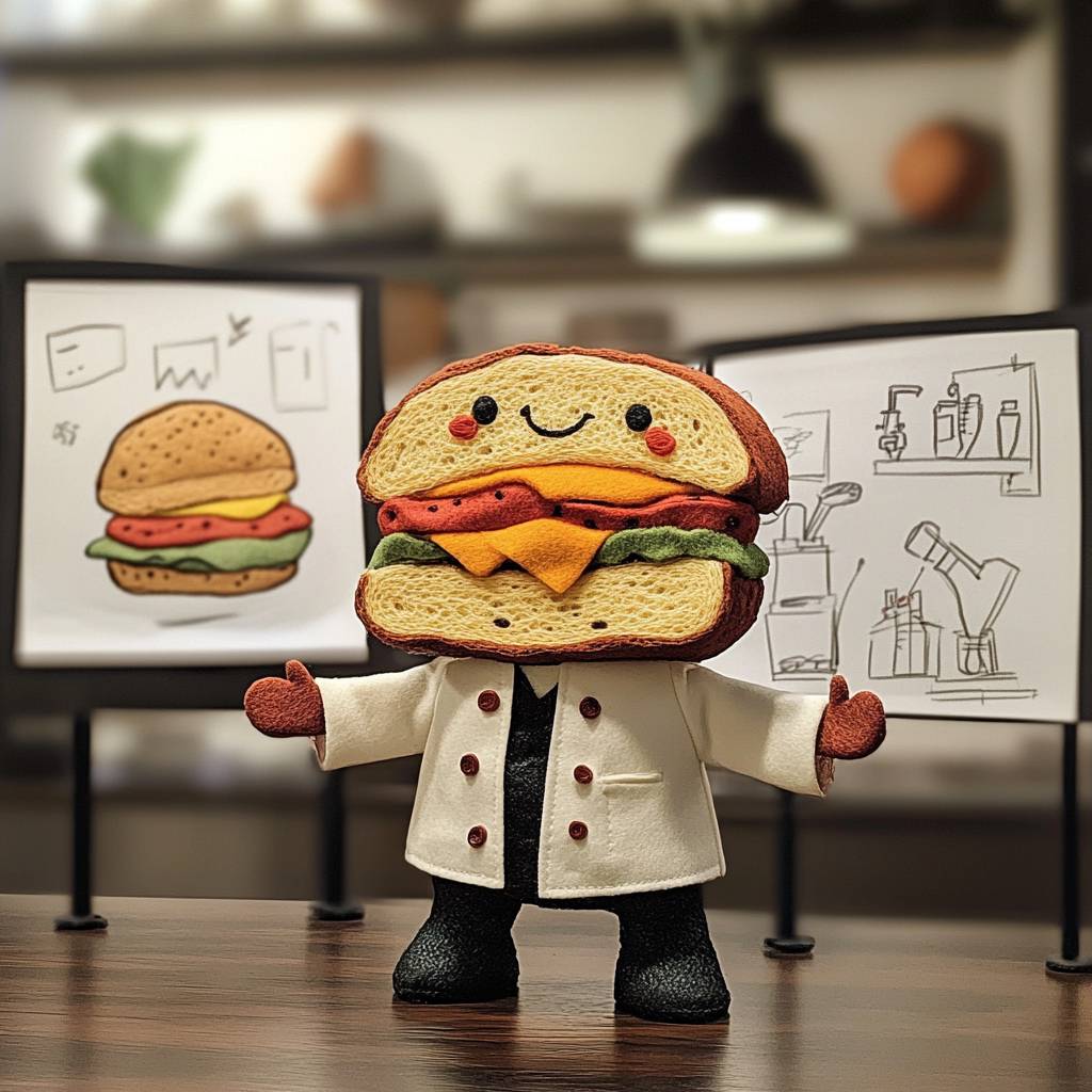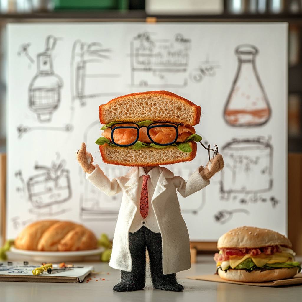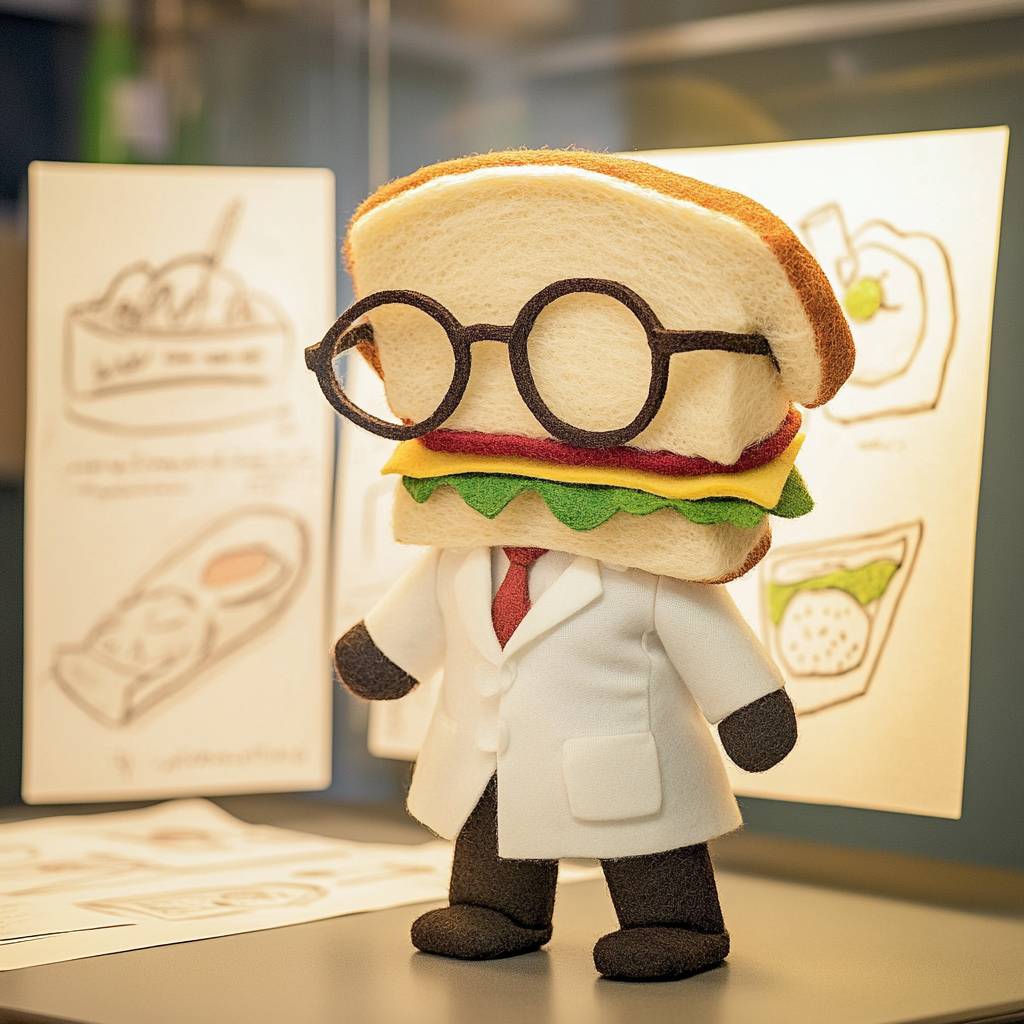 フェルトで作られたサンドイッチを着た科学者のような服装で、食品実験室にいて、その背後のホワイトボードにはサンドイッチの絵が描かれています。