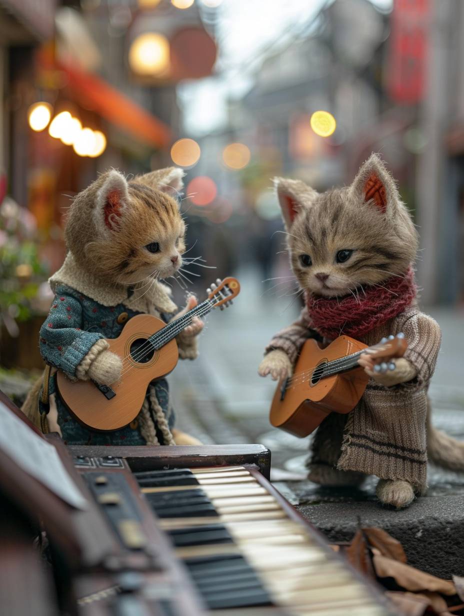 Two kittens, wearing casual clothes,they are playing guitars on a crowded street,one is playing piano,they play the musical instrument as if they were real human, others pass them by,plush doll art,photo by Sony A7R5, shot on 35mm,imitated material --ar 3:4 --stylize 250 --v 6.0