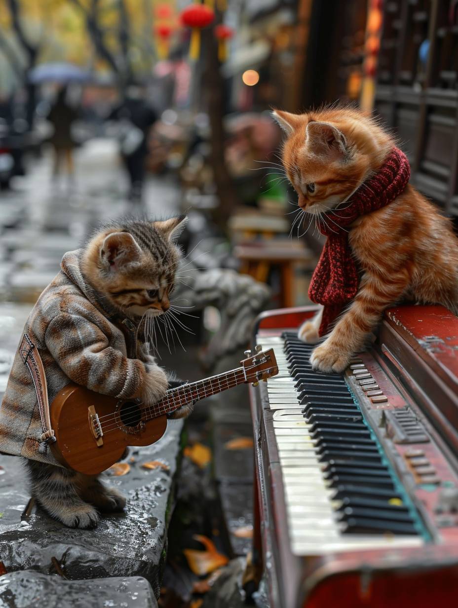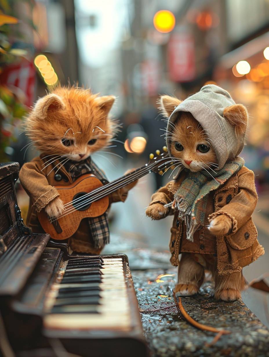 2匹のカジュアルな服を着た子猫が混雑した通りでギターを弾いており、1匹はピアノを弾いている。彼らはまるで人間のように楽器を演奏し、通行人が通り過ぎる。