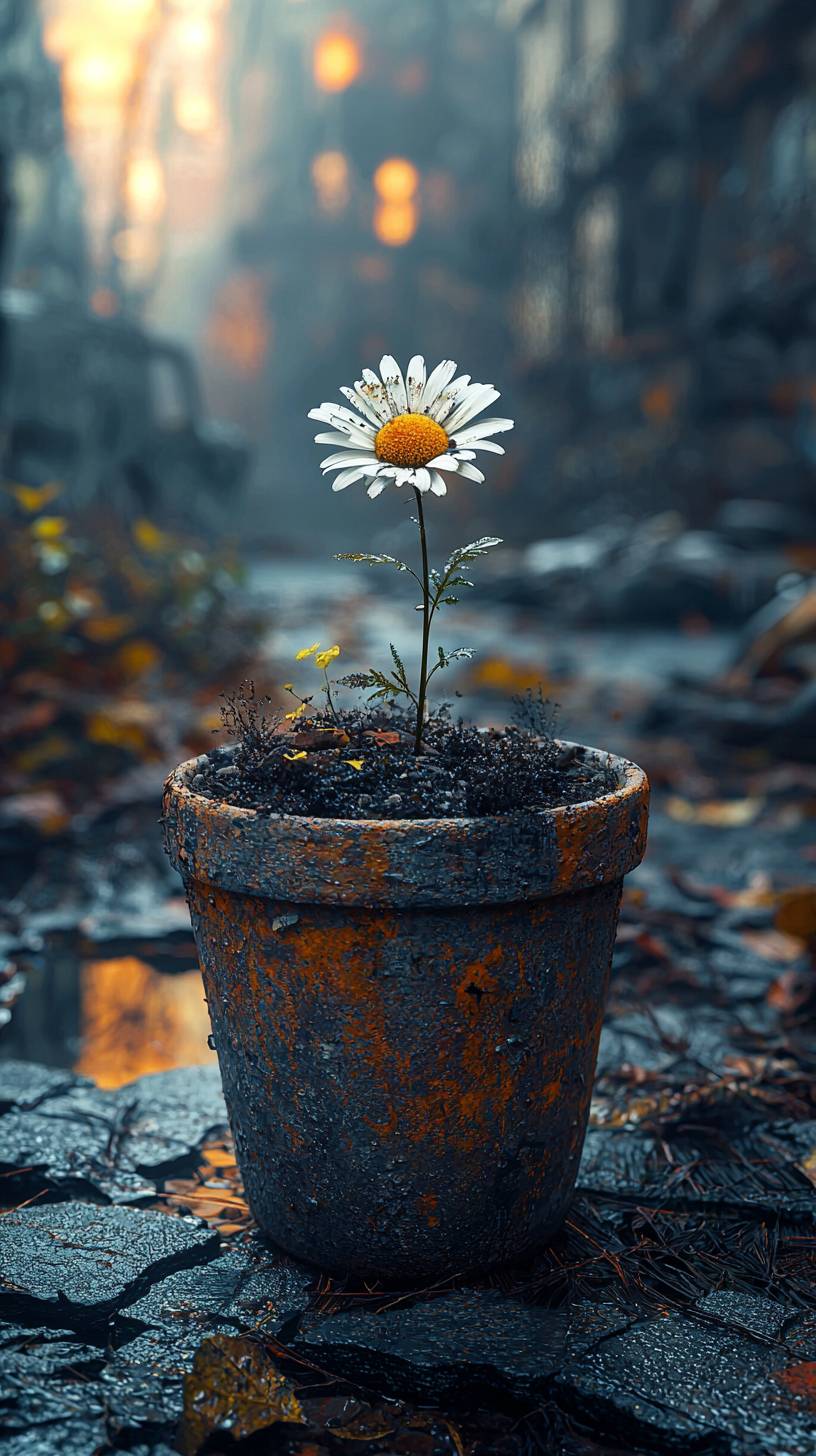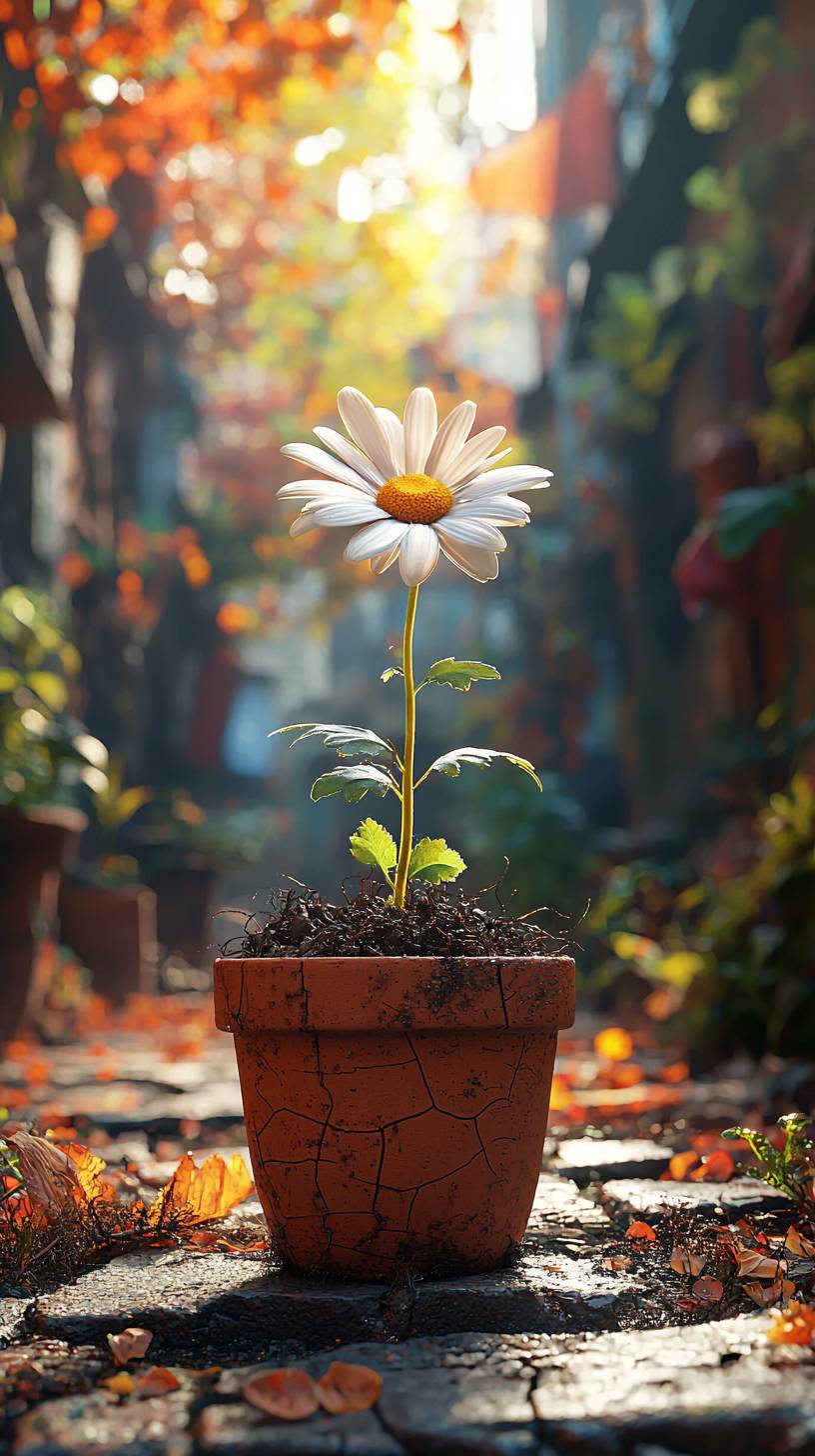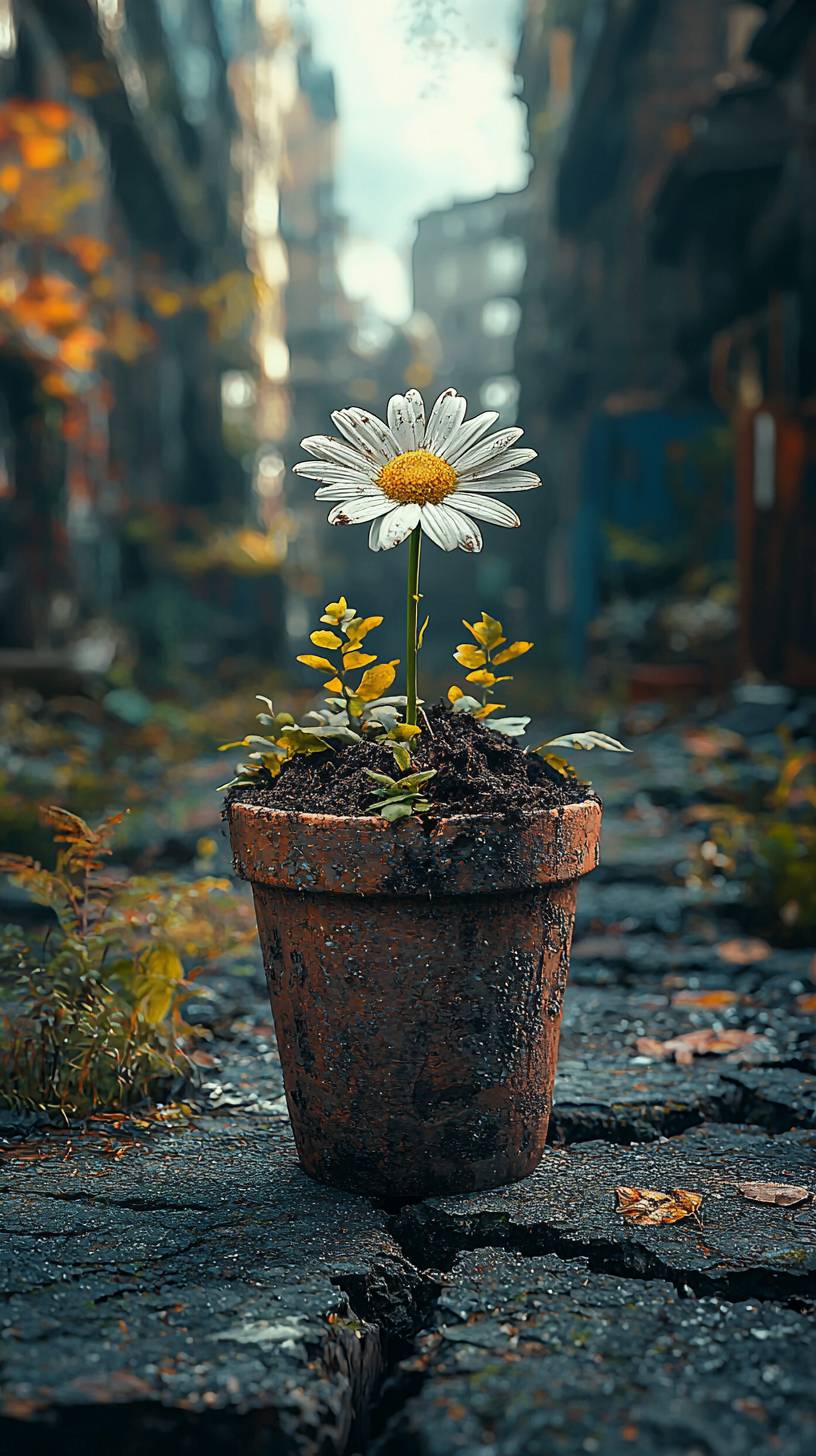土がいっぱいの超小型の粘土の鉢の中に美しいデイジーが植えられ、秋の陽光の中で柔らかく輝いている。それは崩れた道の上に置かれ、放置された街の周りには、自然の成長や老朽化した建物が広がっている。活気がありながらも寂しい雰囲気、フォトリアリスティックなテクスチャ、フィクションからインスパイアされたCGアートワーク、フラッシュ写真効果、壁紙スタイル、精緻なディテール、32k UHD。