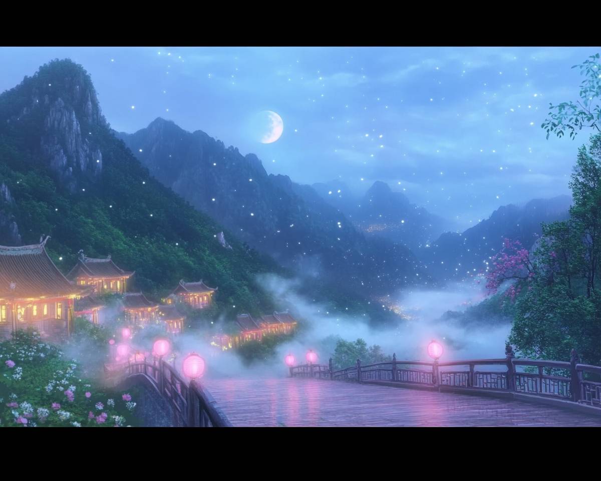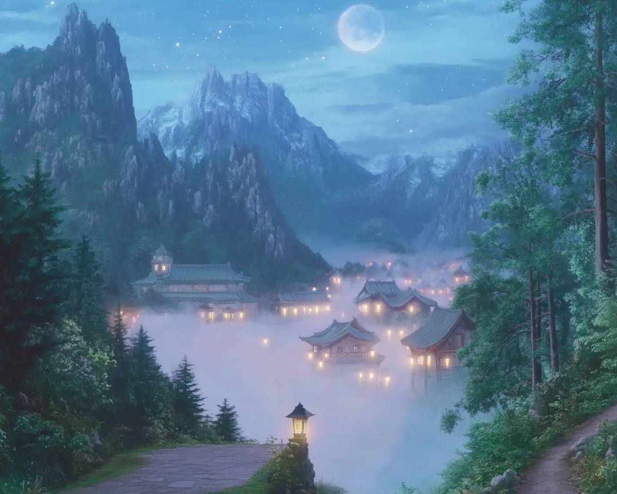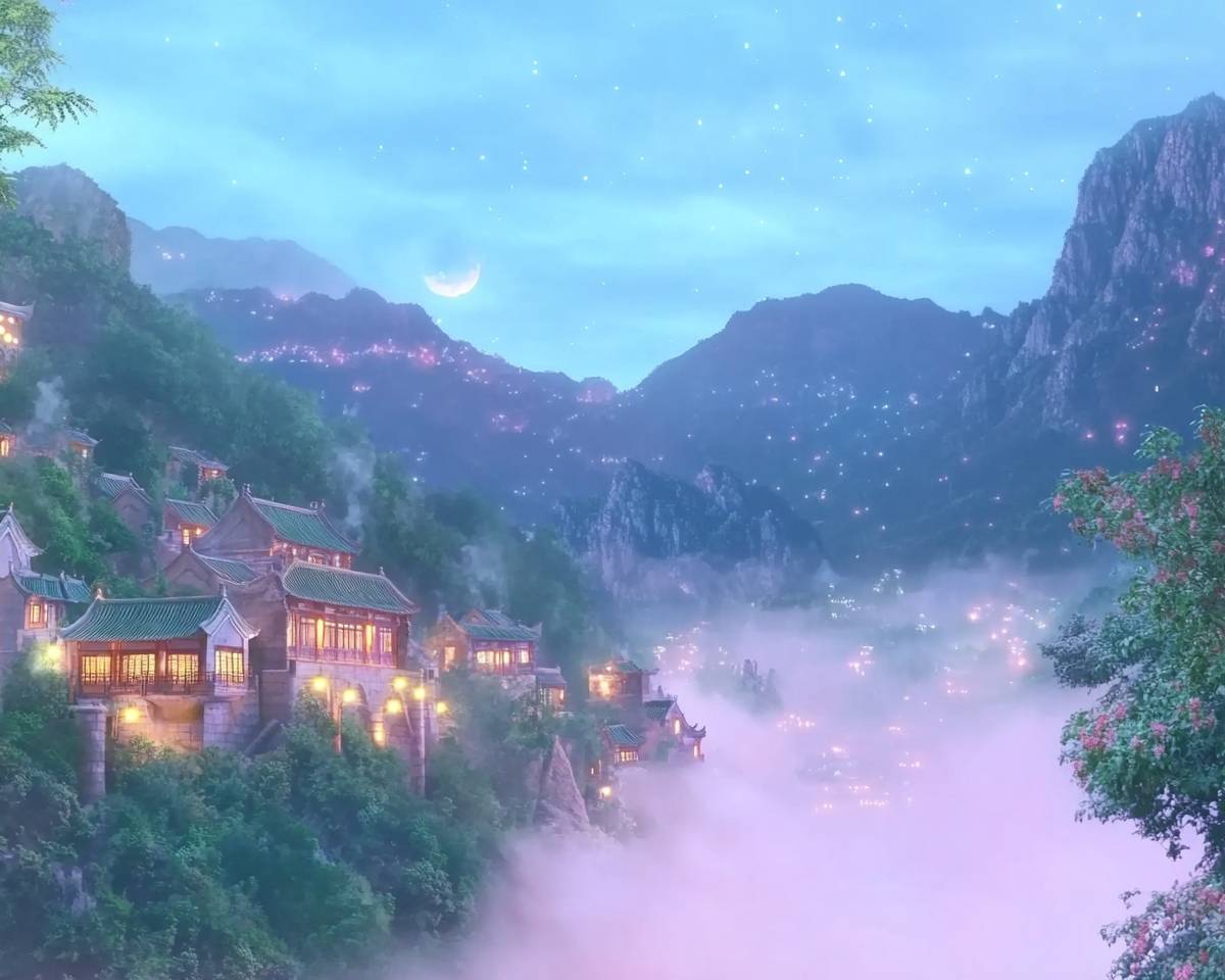 cinematic fairy tale movie scene, breathtaking mountainous landscape, dark blue sky, foggy night, many illuminated houses, in china --sref 1076927390 338506 501716065 --ar 5:4
