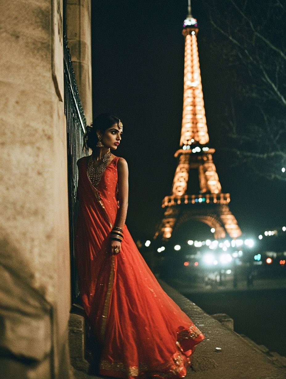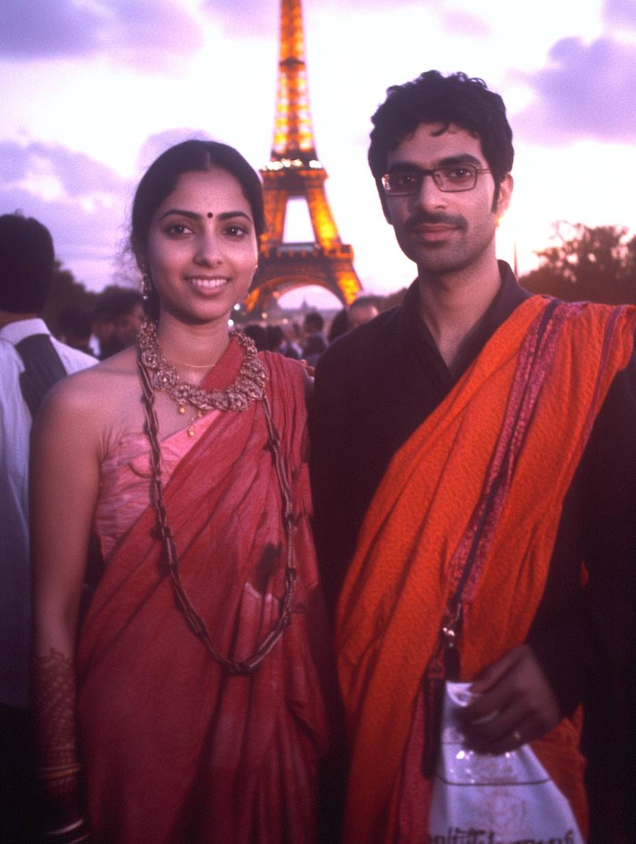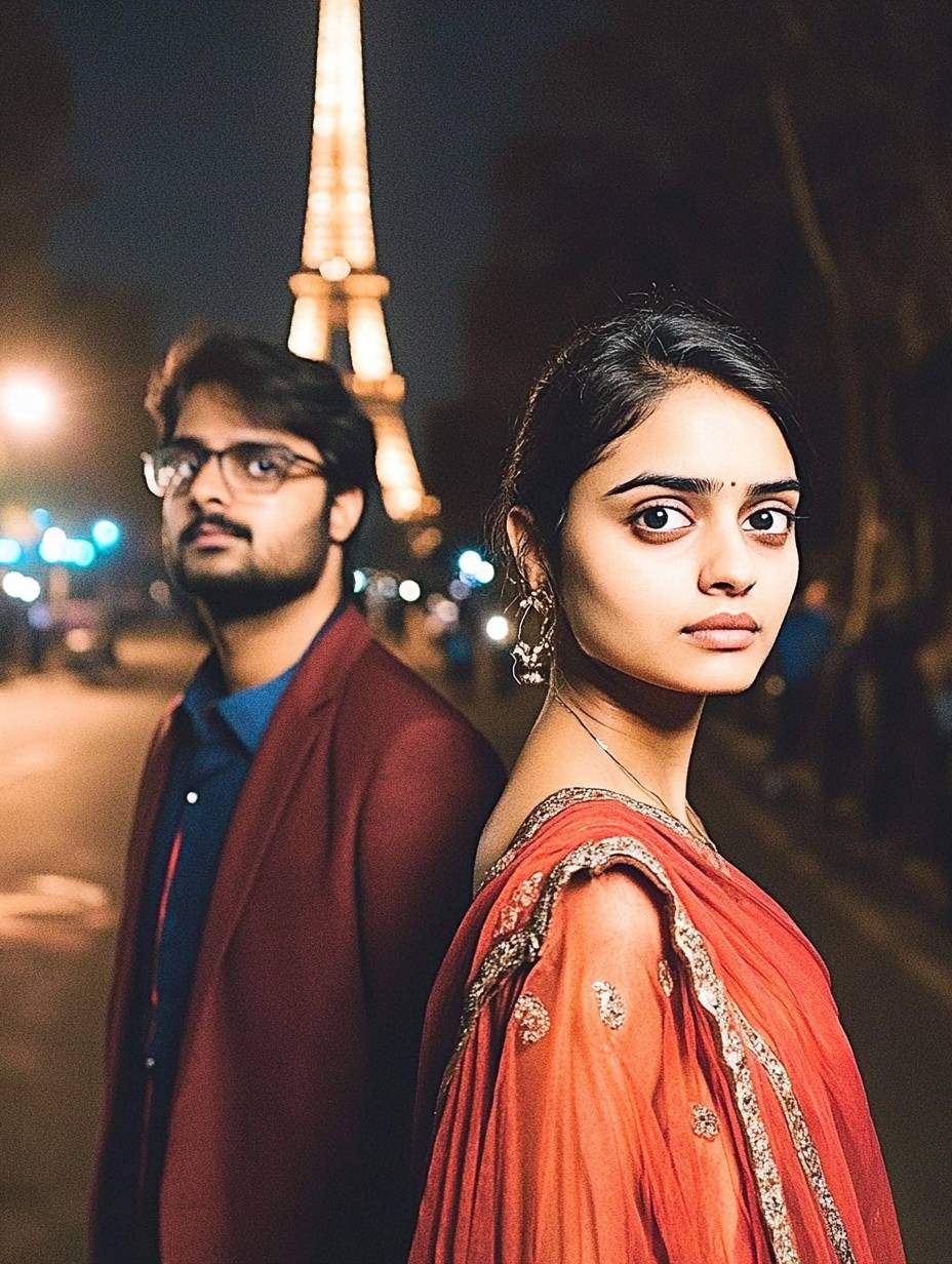 A photograph of an Indian brunette Couple 28-30 years old , dressed stylish, standing at night with the Eiffel Tower in the background, looking towards the camera, fuji film --chaos 60 --ar 3:4 --weird 300 --v 6.1
