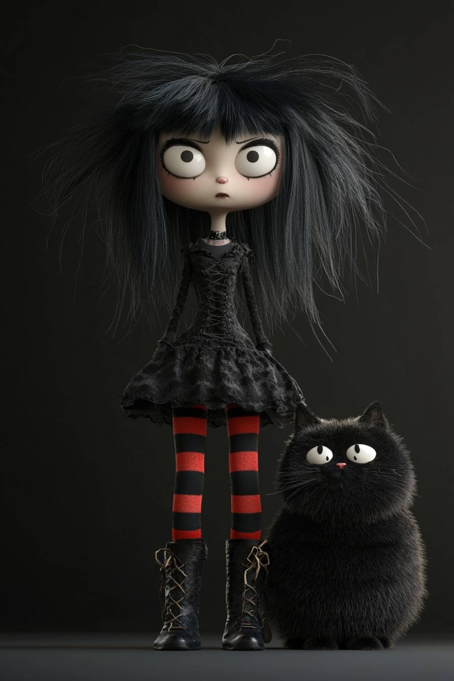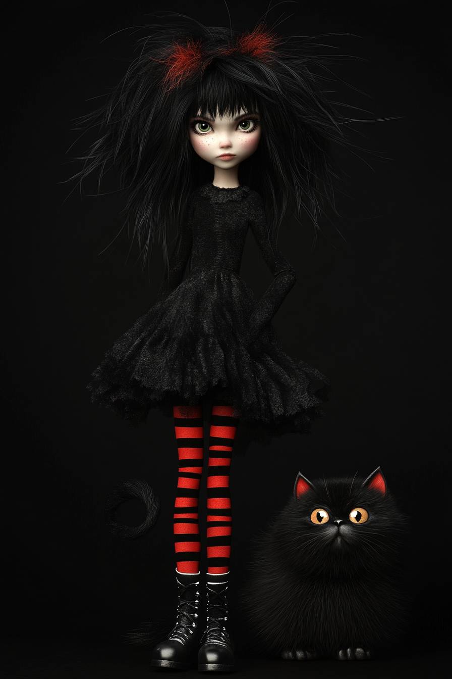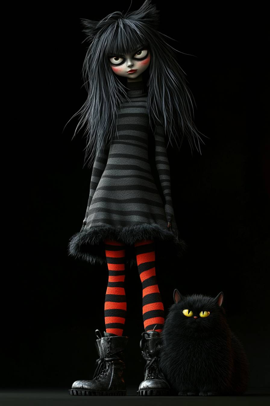 3d illustration, a young girl with exaggerated fluffy long shaggy messy black hair. Black dress with striped black and red tights and large Black boots. She has a fat fluffy black cat next to her. Black background. --ar 2:3