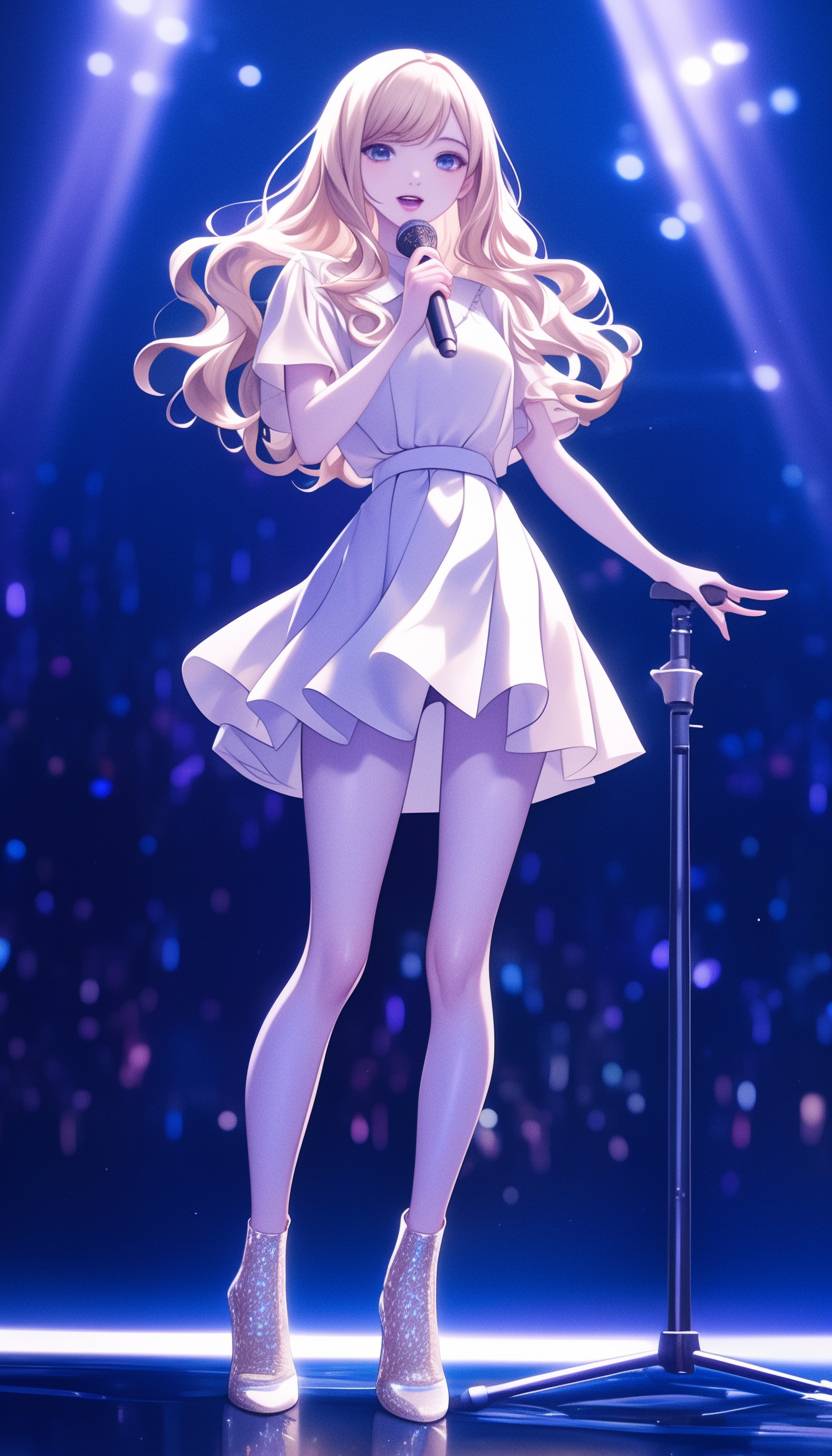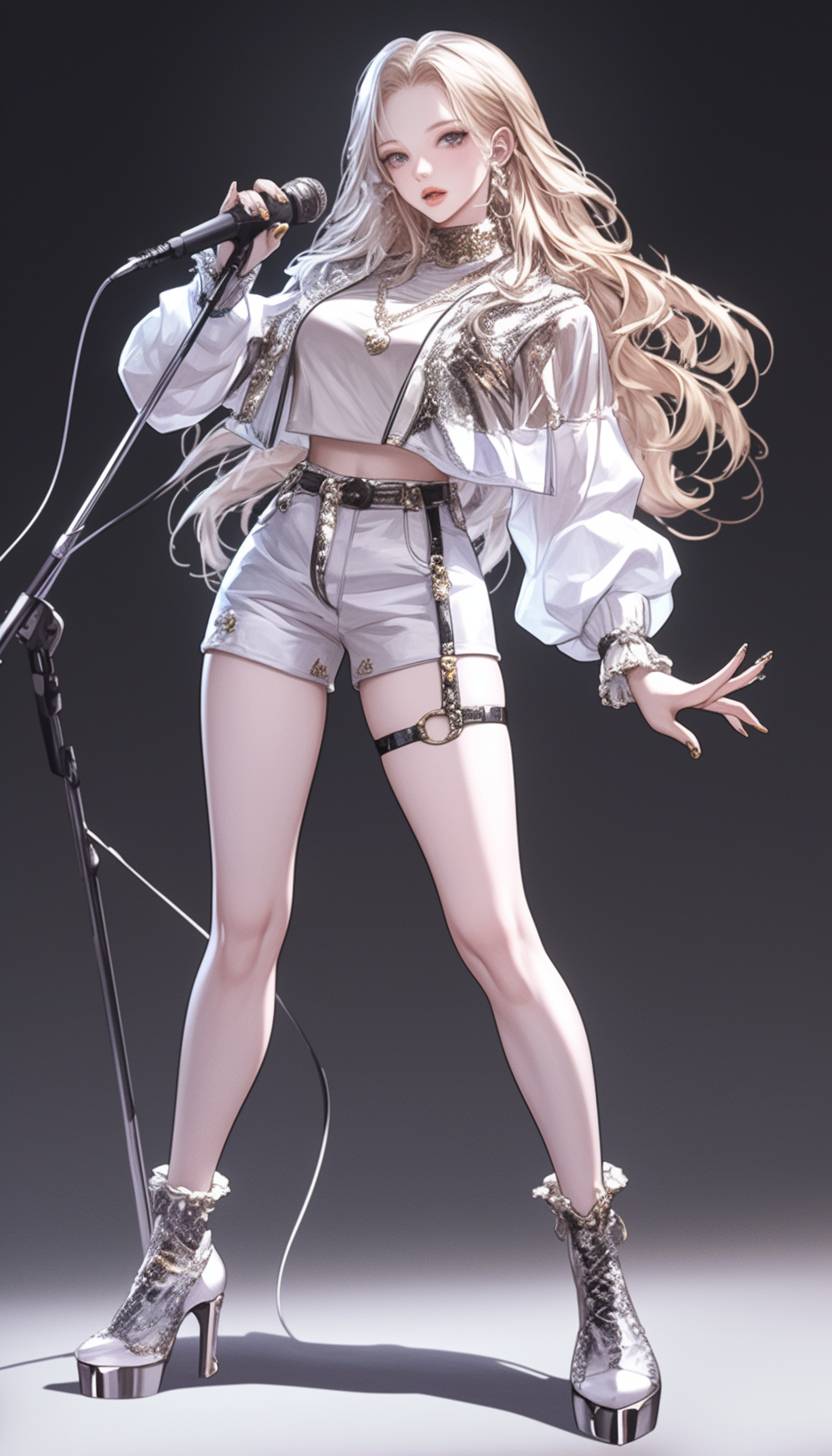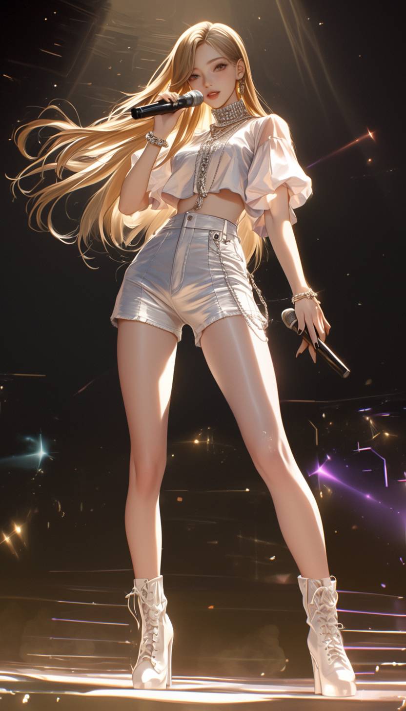 肌が白くて繊細な女性アイドル兼ラップシンガーが、マイクを持って豪華なステージで歌っている。輝くハイライトのある髪、流れるような金髪、白い半袖トップス、銀のネックレス、白と黒のハイヒールを履いている。マイクを持ち、全身が映るように自然に立っている。背景はシンプルでクリーン、ステージの照明、スナップショットの写真、レイトレーシングの反射、超ミニマリスト、8k解像度、アニメスタイル、非常に詳細。