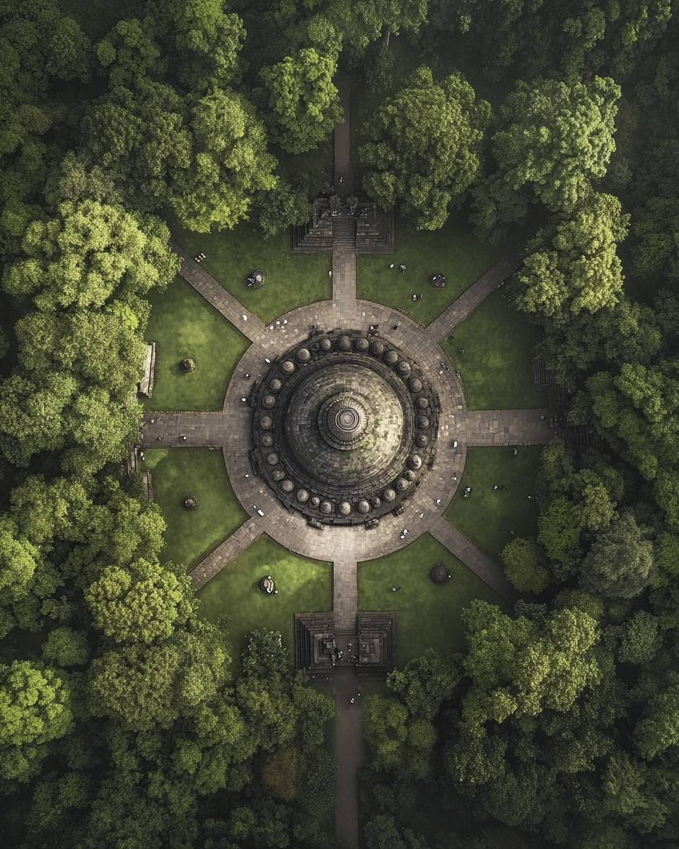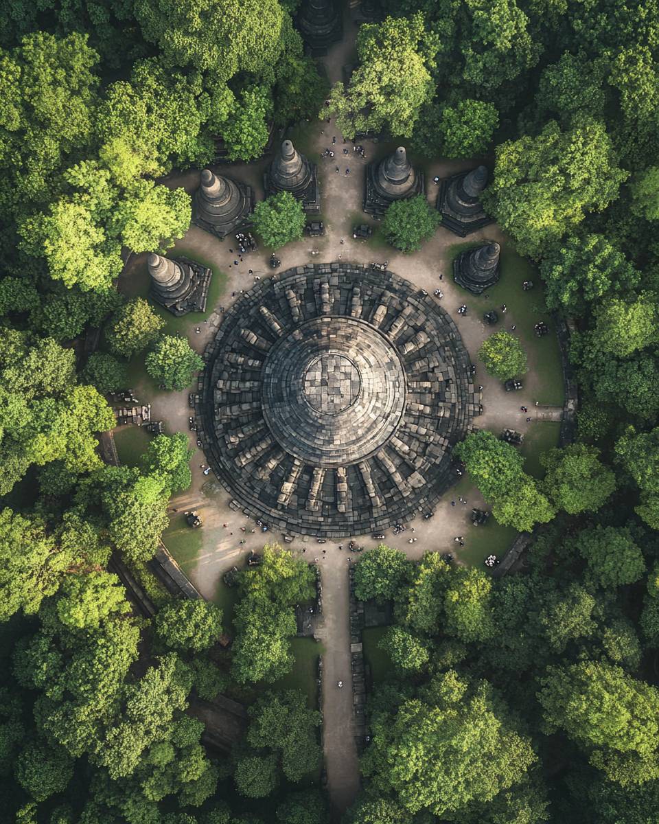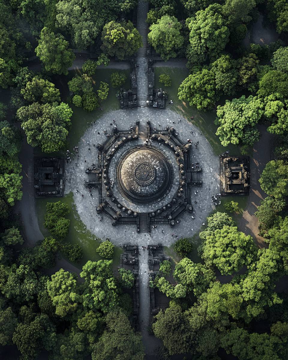 インドネシアのボロブドゥール寺院の鳥瞰図で、ナショナルジオグラフィックの写真家がソニーαカメラで撮影しました。写真は上方から撮影されており、緑の木々に囲まれた広大な空間を示しています。前方には多くの複雑な彫刻が施された大きな円形の石造物があります。広場の両側にはさらにいくつかの小さな寺院があります。また、人々が歩き回ったり座っている姿も見え、穏やかで静かな雰囲気です。