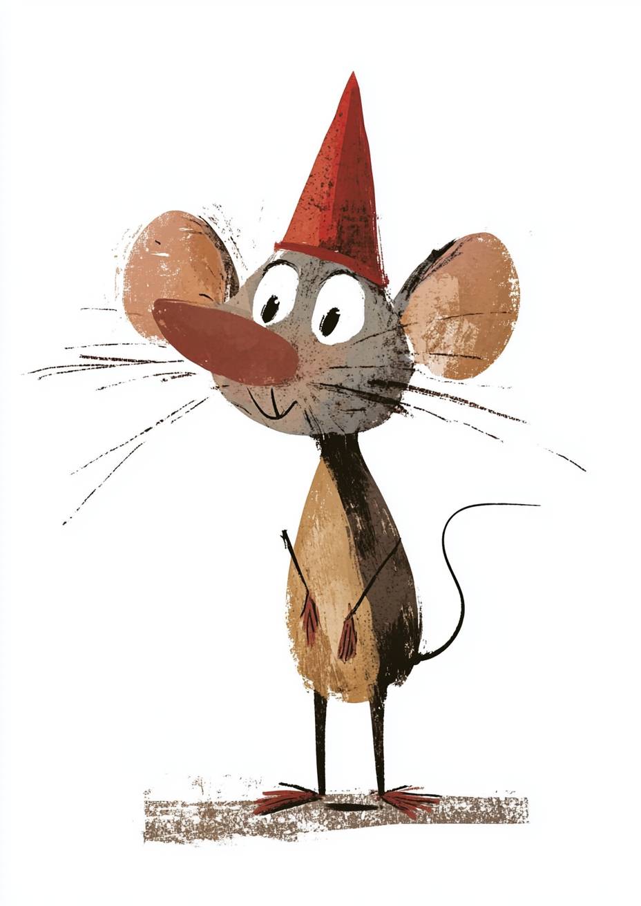 Children's book illustration of a slim line toothpick legged funny mouse with a big nose standing on two feet, wearing a red hat,with a simple color palette in the style of Oliver Jeffers and Picasso, flat white background, --ar 5:7 --v 6.1