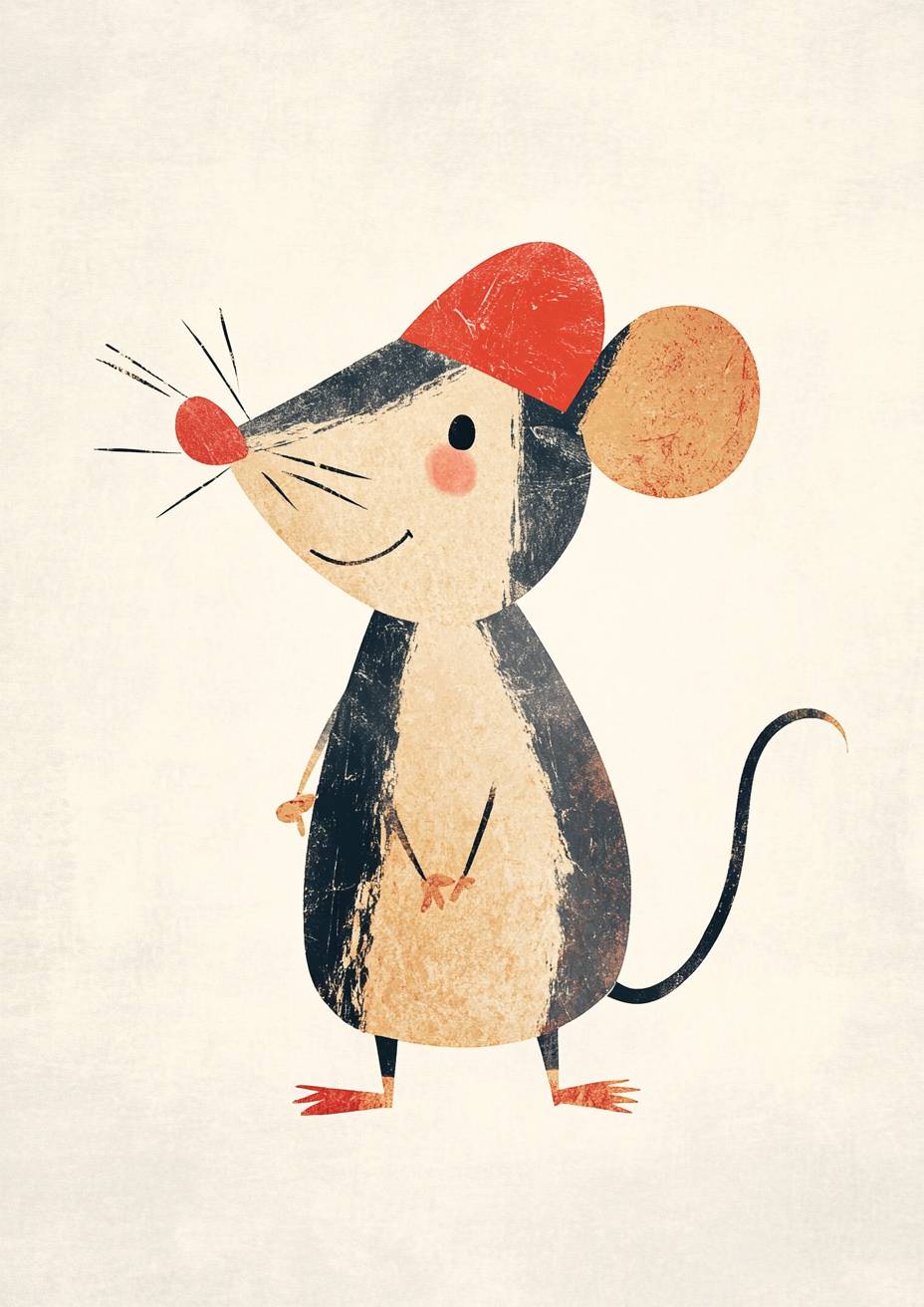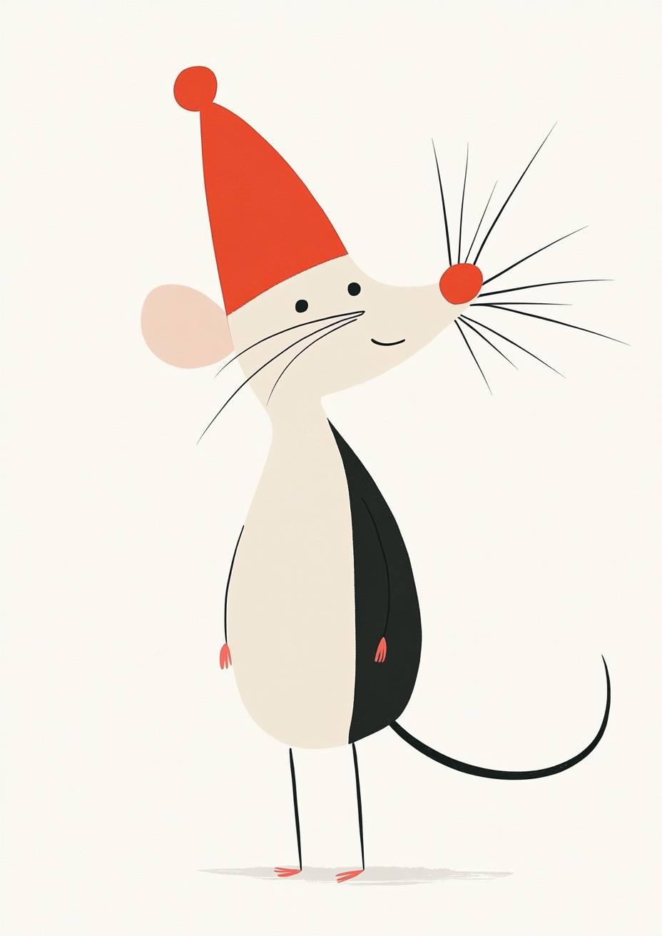 イラストには、スリムな爪楊枝のような脚を持ち、大きな鼻を突き出している面白いネズミが描かれています。2本足で立っていて、赤い帽子をかぶっています。オリバー・ジェファーズやピカソのスタイルでシンプルな色彩パレットが使われており、背景はフラットな白です。