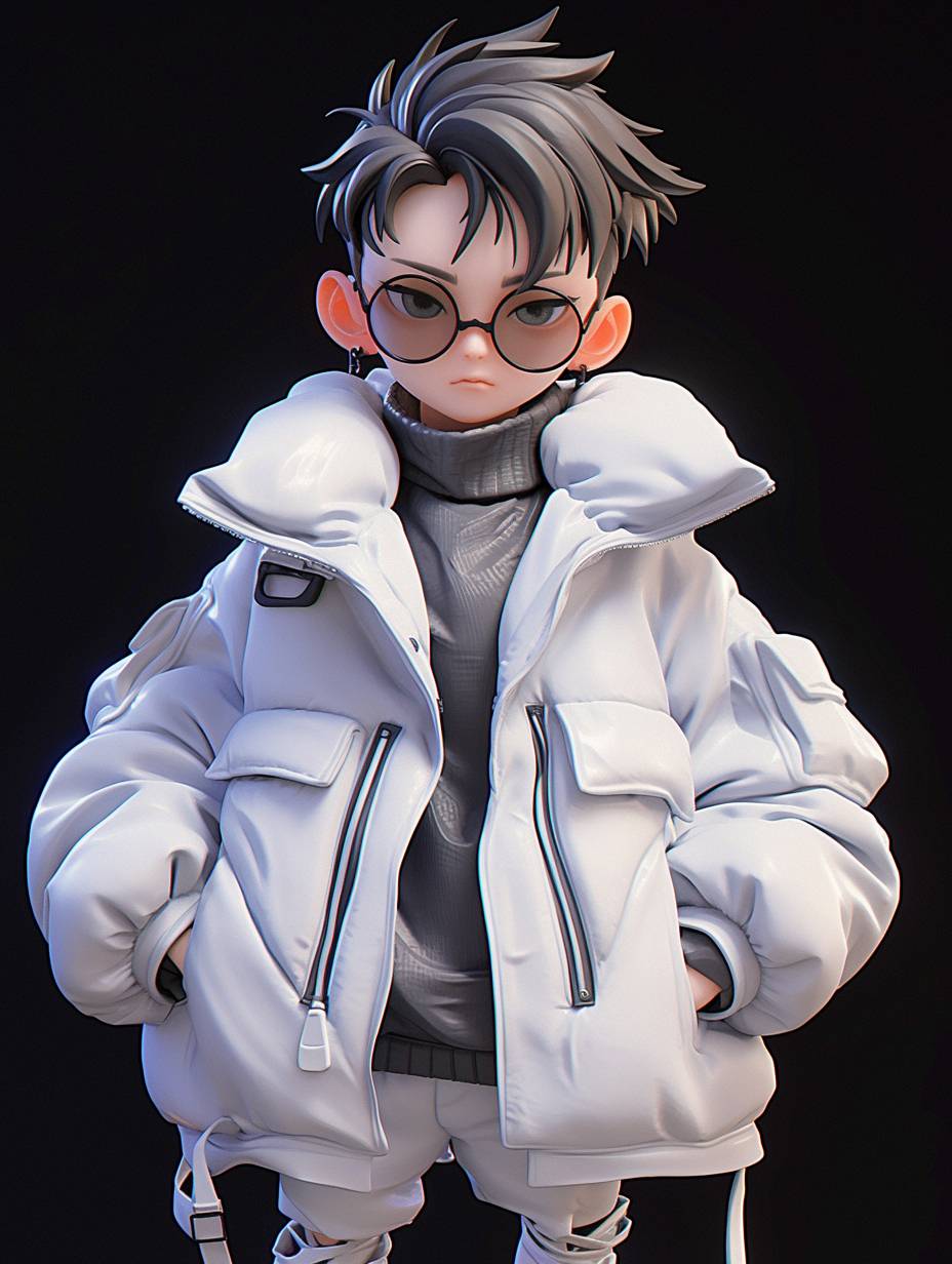a 3D cool boy,black eyes,cool look,Very fierce expression,pop mart style,wearing a white jacket,Clay material,sneakers,3D rendering --ar 3:4 --niji 6