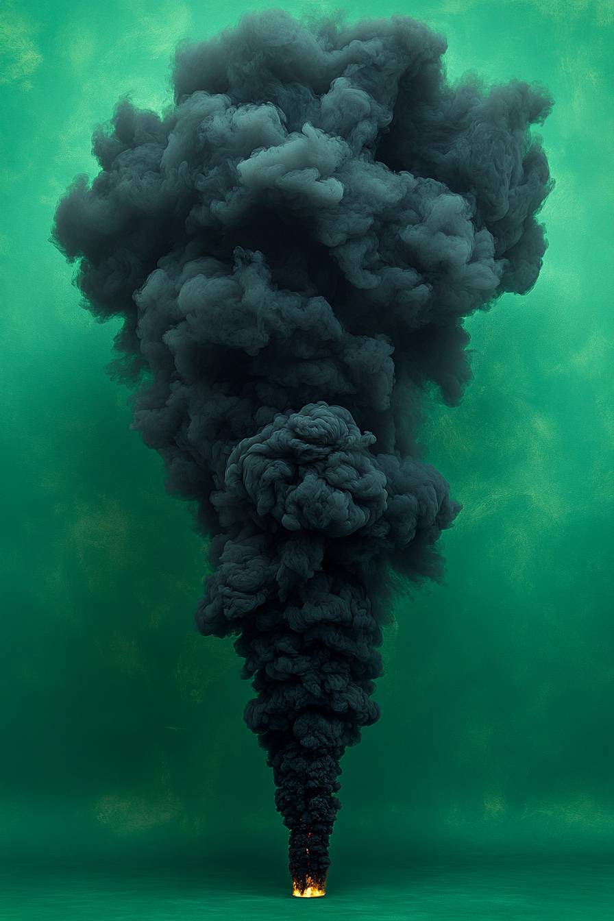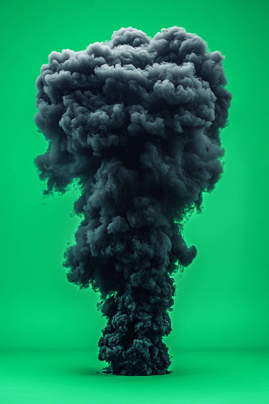 acrid black smoke billowing upwards in front of a solid green screen backdrop, macro photography, studio quality with gritty art direction --chaos 20 --ar 2:3 --stylize 500 --v 6.1