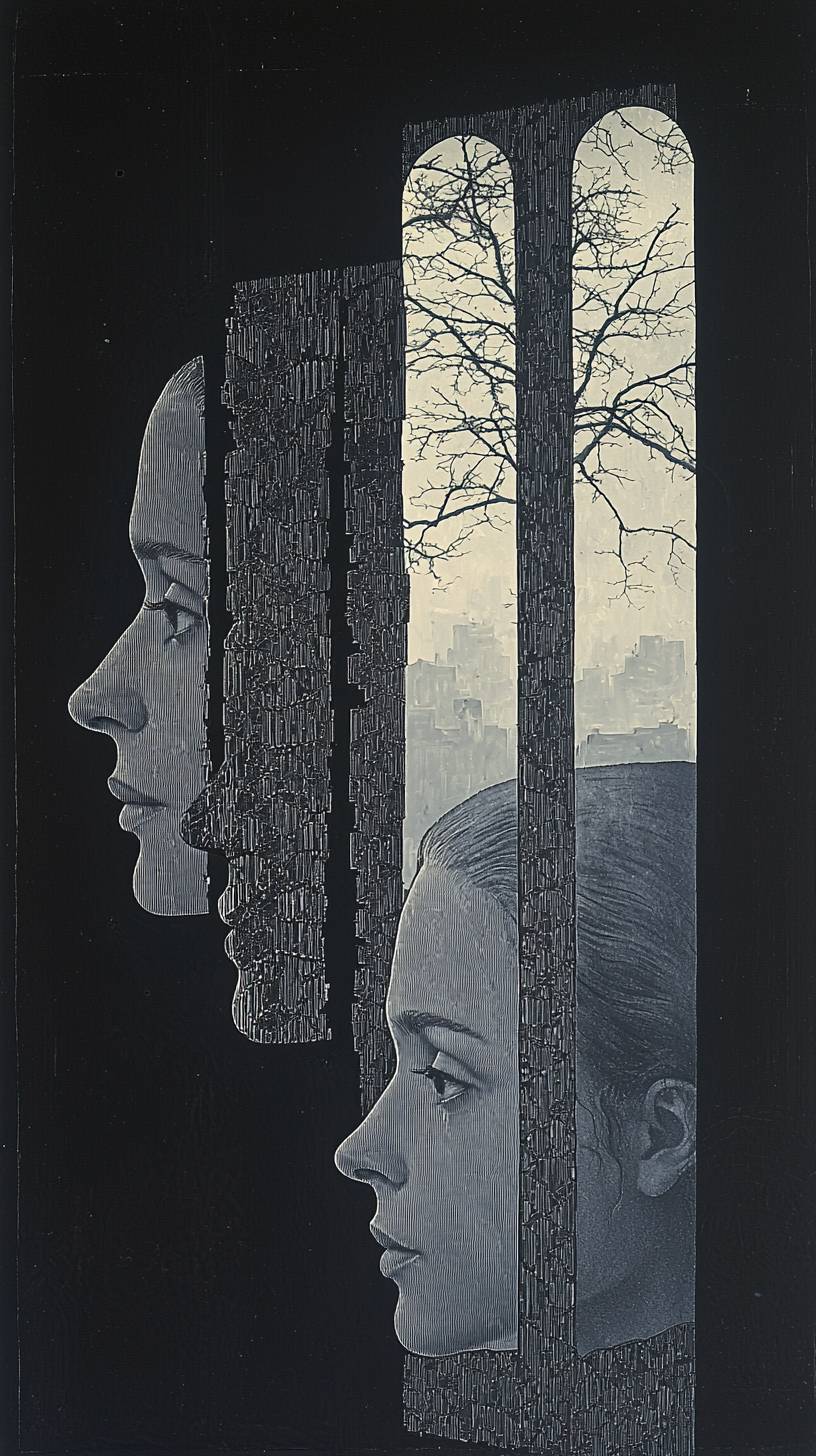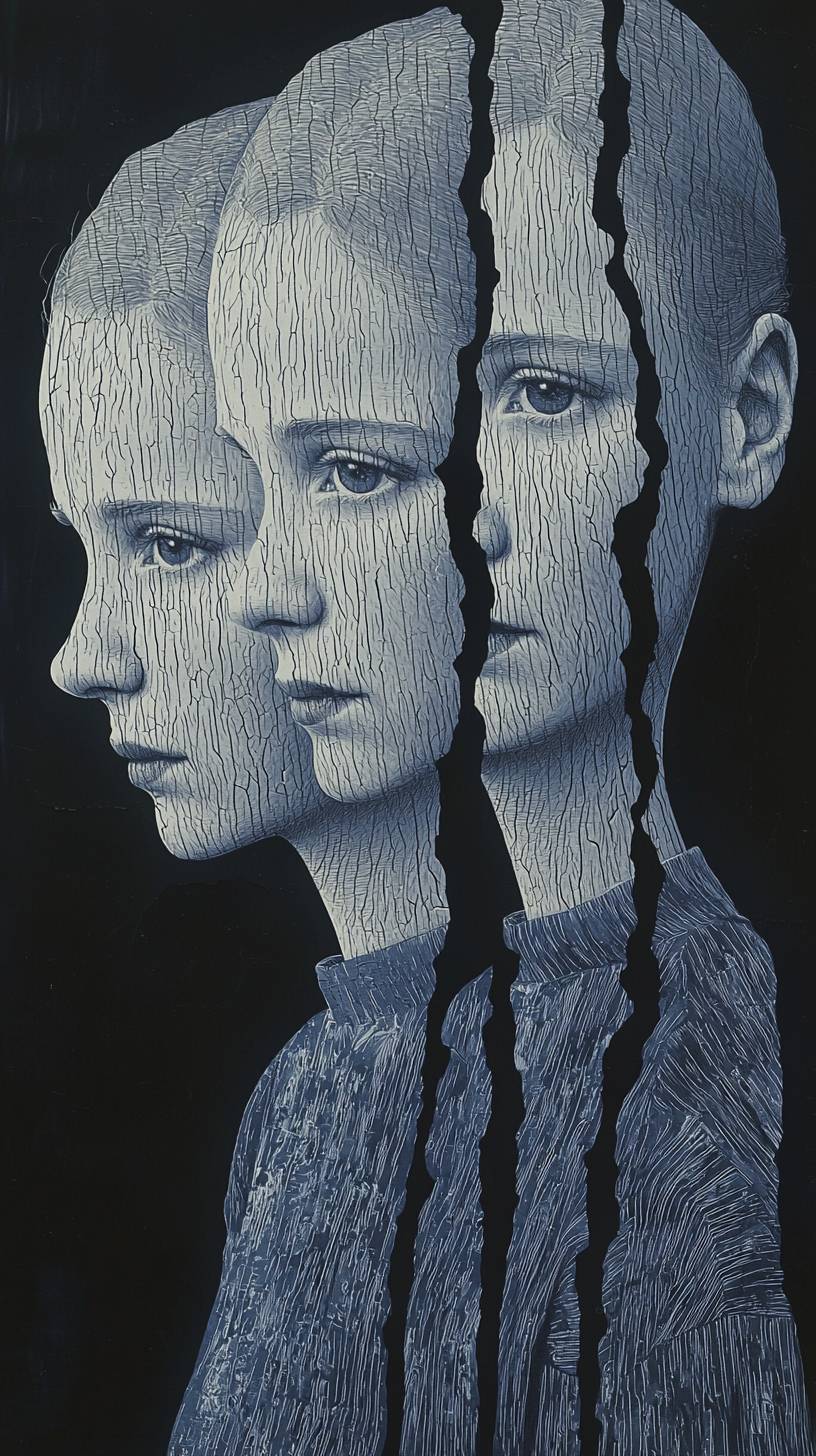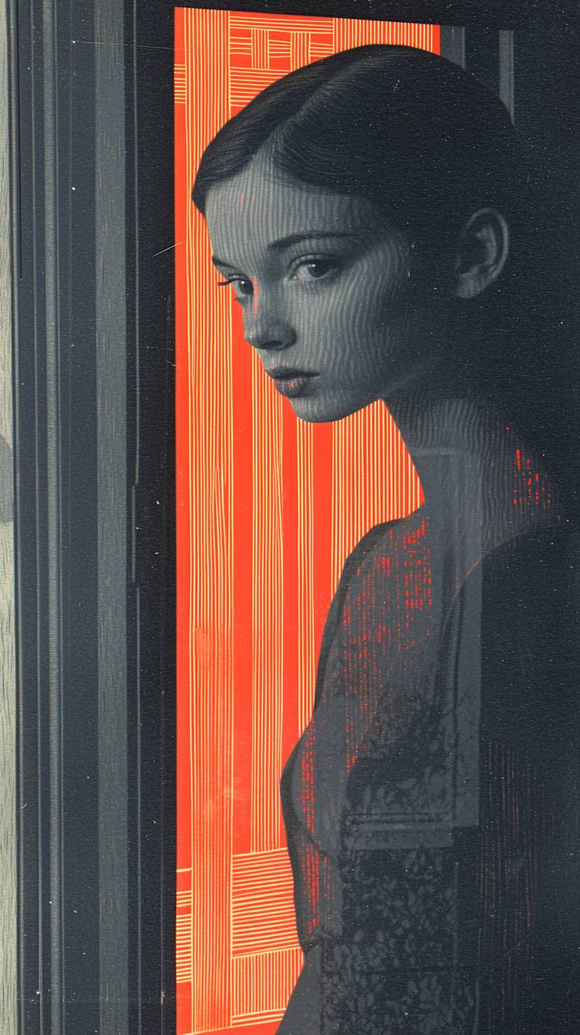 記憶の解明、同じ率直な写真における異なる年齢の女性、実験的なダーク美学スタイルのポラロイド、同じ人物の異なる年齢の対比、めまい効果、ドラマチックな照明、ミラーグラス効果、キャンディッド写真、2000年代のパルプフィクション美学、細かい粒子、ネオン、ASCII、ボケ効果、点描法、興味深い女性を使用した美学的な色彩