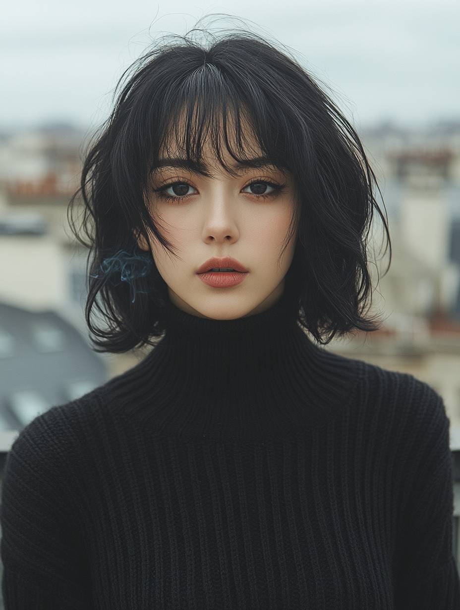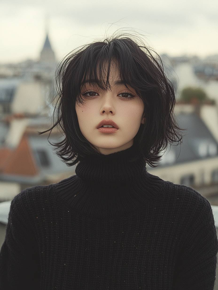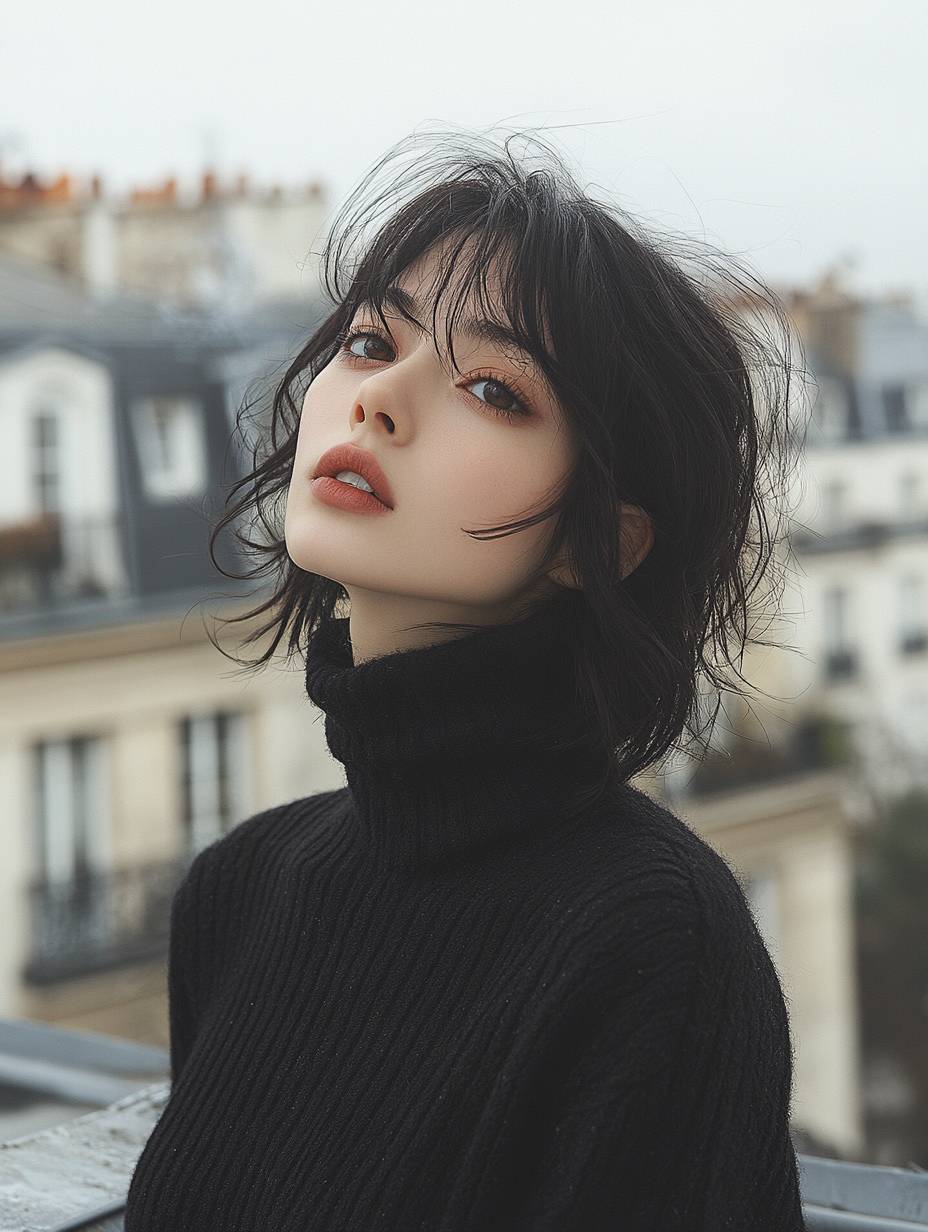 アジア系の女性が短い黒髪と前髪を持ち、タートルネックのセーターを着てパリの屋上で煙草を吸っています。彼女は1990年代スタイルの黒いペンシルスカートを着用し、粒子感のあるフィルム・ノワール美学を醸し出しています。
