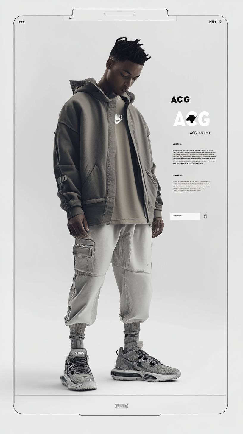 UI design of the website for "Nike ACG", web page, white background, modern UI interface with buttons and text boxes, minimalistic style, large logo on the right side that says "ACG", hyper realistic photo, high resolution in the style of Nike ACG. --ar 9:16 --video --v 6.1