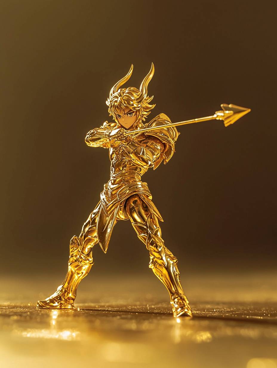 An exquisitely crafted small figurine of Saint Seiya, meticulously sculpted from pure gold to capture Seiya's heroic stance. The entire figurine, including the face, is rendered in gold, emphasizing its complete gold construction. Seiya wears a golden helmet resembling Taurus, adding a regal and powerful aura. He holds the radiant arrow without any light effects, maintaining a realistic appearance. The minimalist gold base background enhances the brilliance and detail of the gold, creating a striking contrast. The design seamlessly blends Japanese anime aesthetics with modern craftsmanship, generating a mysterious and glamorous atmosphere. Rich details highlight every texture of the armor, emphasizing the intricate engravings and metallic sheen. Soft lighting accentuates the gold's luster, while shadows add depth to the composition. --ar 3:4 --quality 2 --style raw --v 6.1