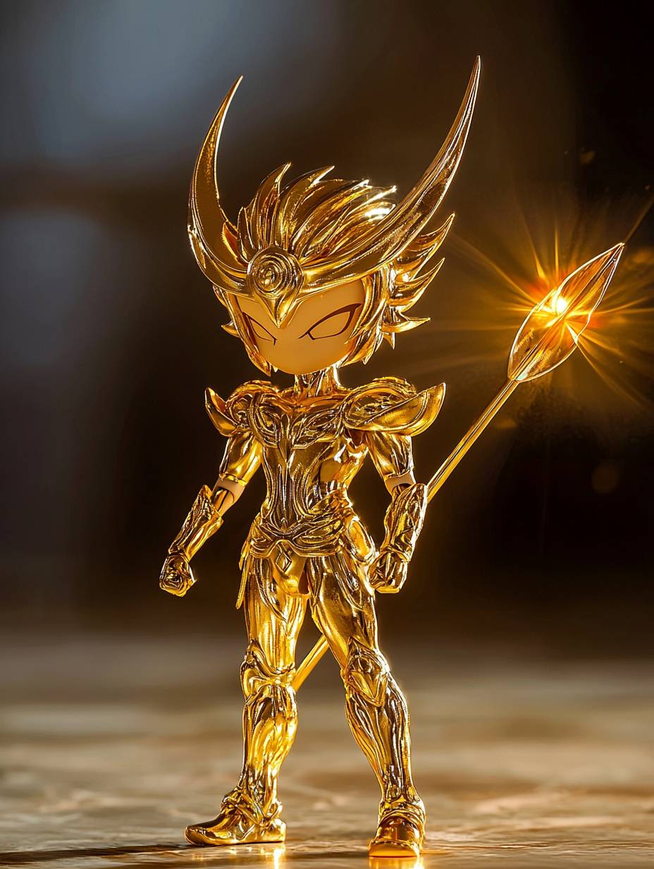 星矢の英雄的な姿を捉えるために純金から精巧に彫刻された小さな聖闘士のフィギュア。顔を含むフィギュア全体が金で表現されており、全てが金でできていることが強調されています。星矢は金牛宮に似た金のヘルメットをかぶり、王族的で力強いオーラを放っています。彼は光効果なしで輝く矢を握り、リアルな外観を保っています。ミニマリストの金の背景が金の輝きと細部を引き立て、鮮やかなコントラストを生み出します。デザインは日本のアニメ美学と現代のクラフトマンシップをシームレスに融合させ、神秘的で魅力的な雰囲気を生み出します。豊かなディテールは鎧のすべての質感を強調し、複雑な彫刻と金属の光沢を際立たせます。柔らかな照明が金の輝きを引き立て、影が構図に深みを加えています。