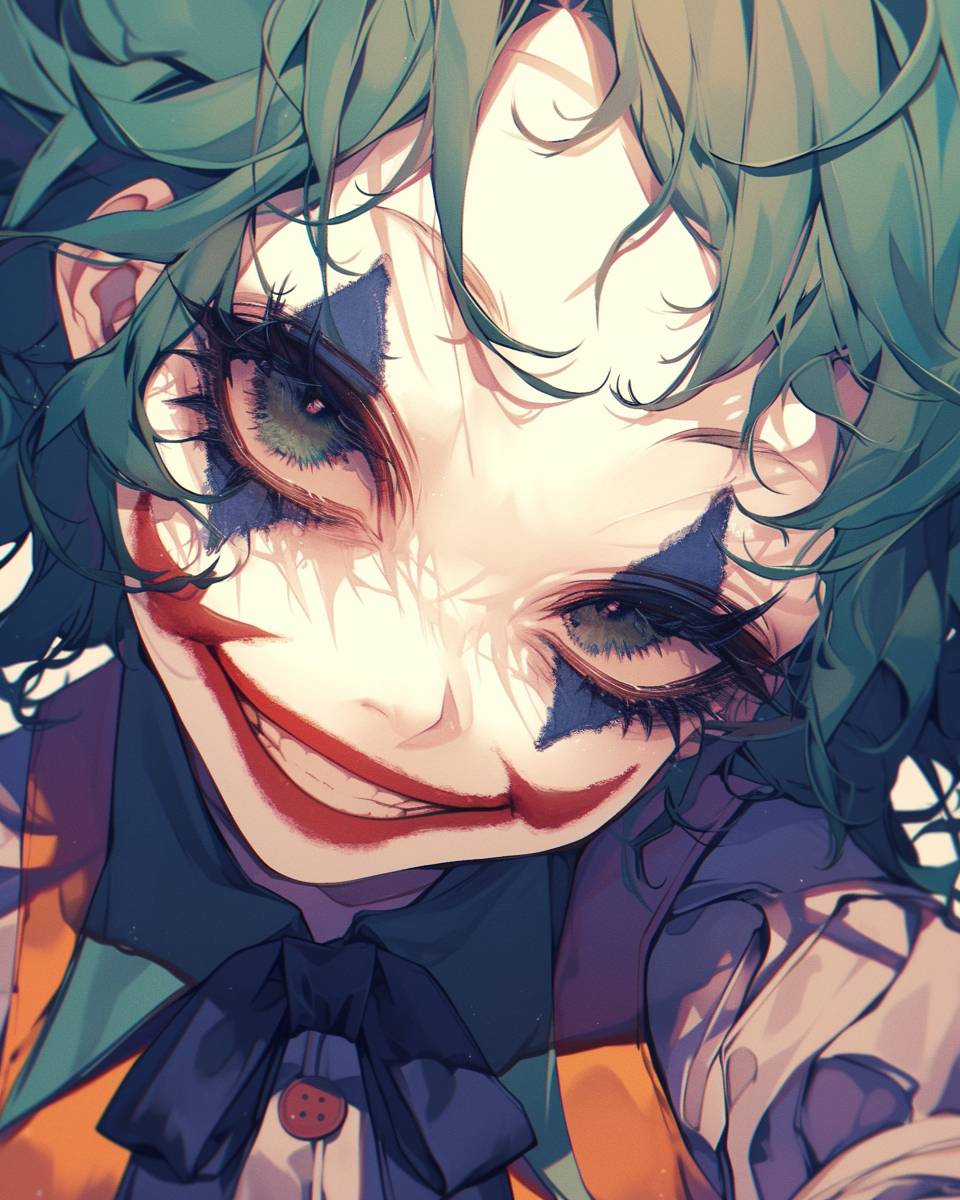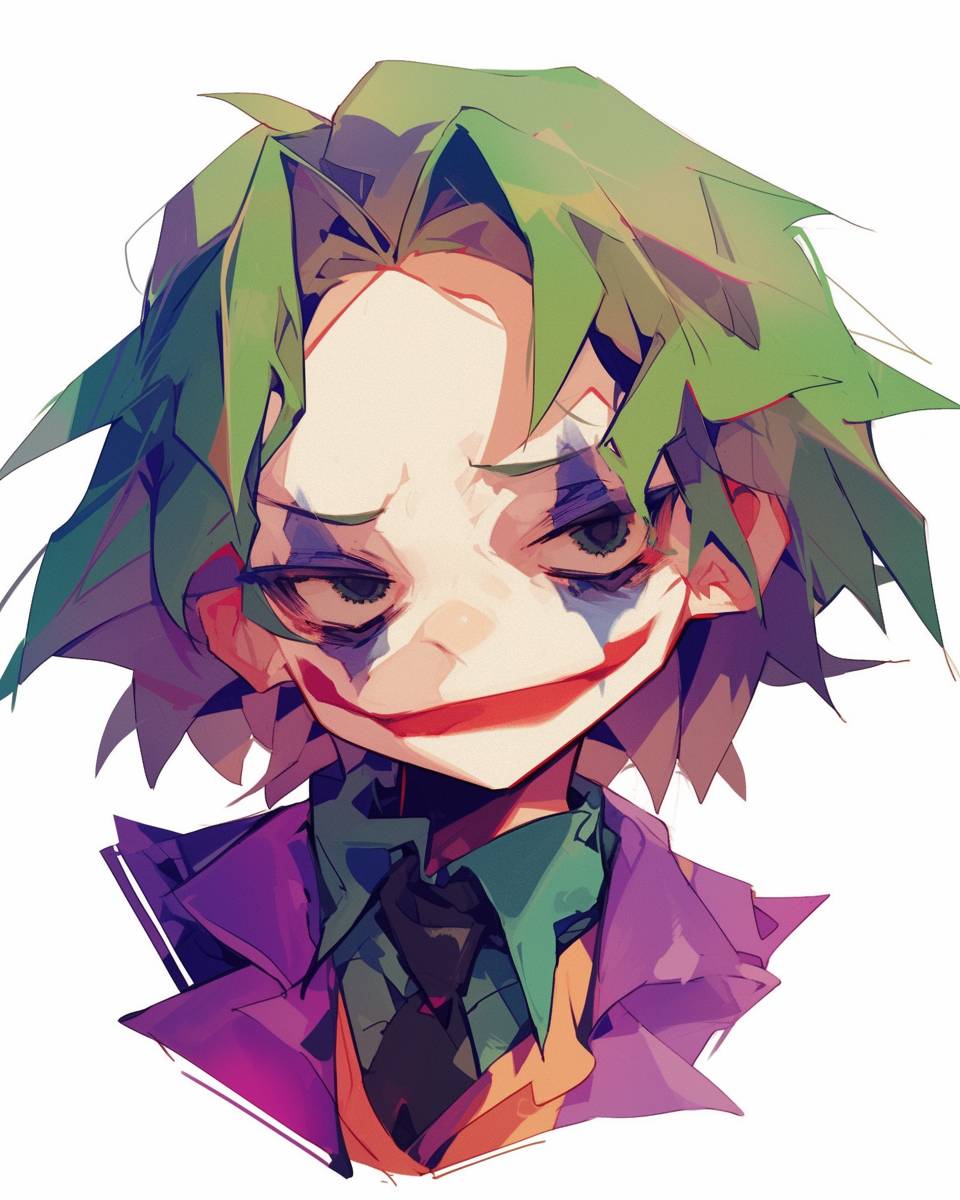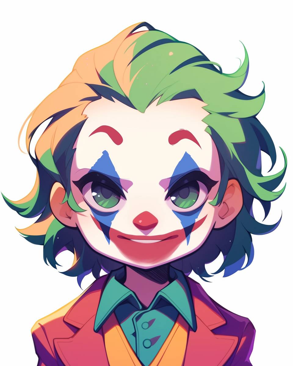 大きな頭と小さな体、シンプルな顔の特徴を持つ、アニメスタイルのハッピーなジョーカーのキャラクター肖像。