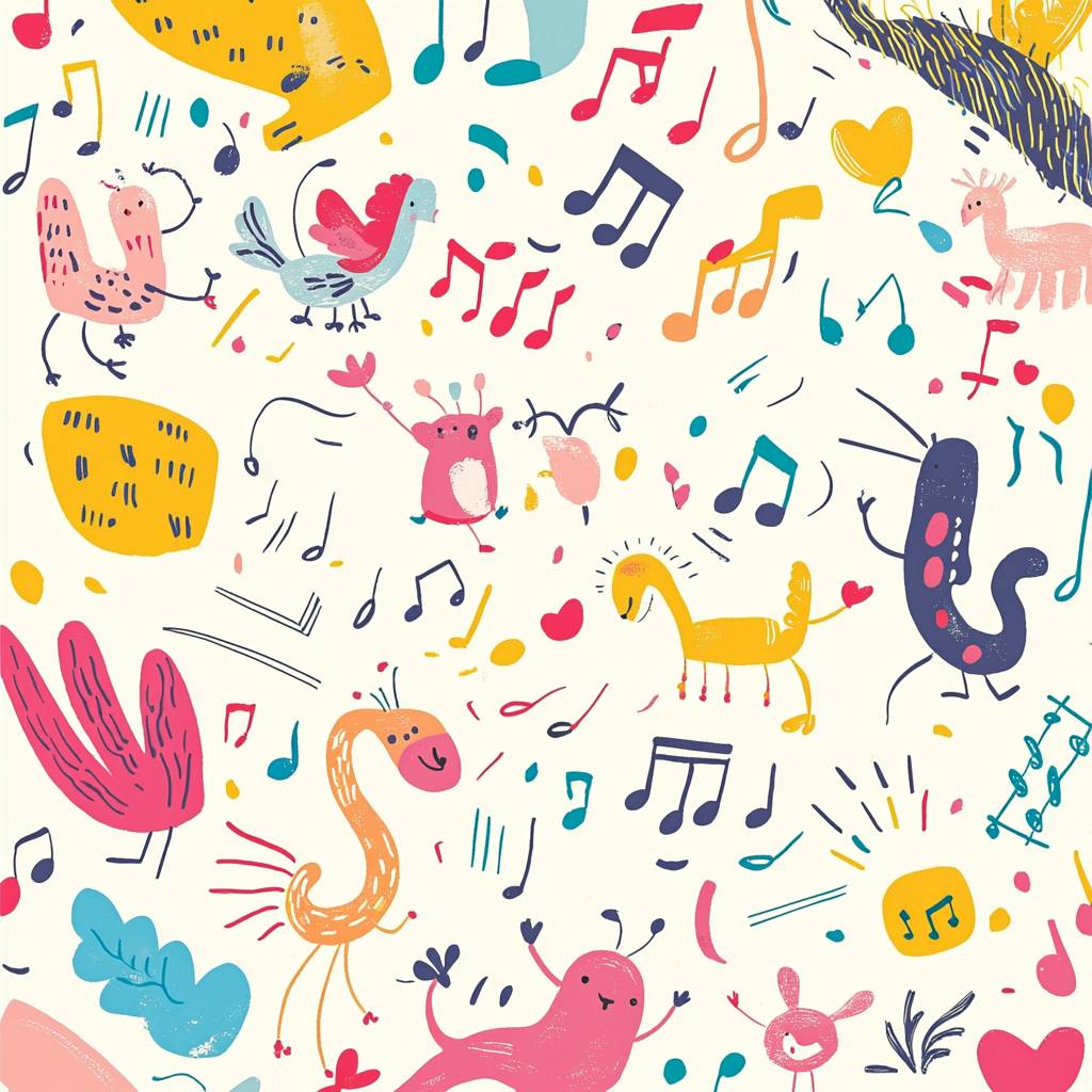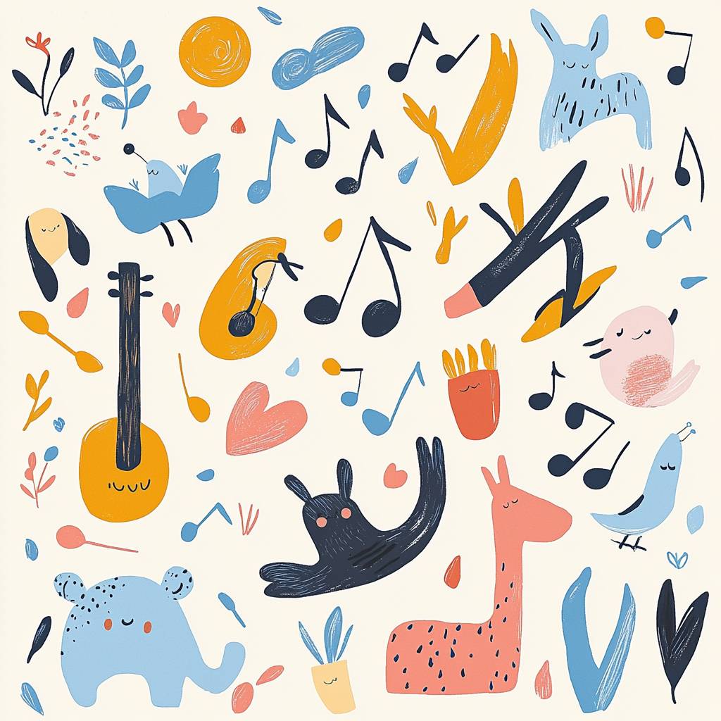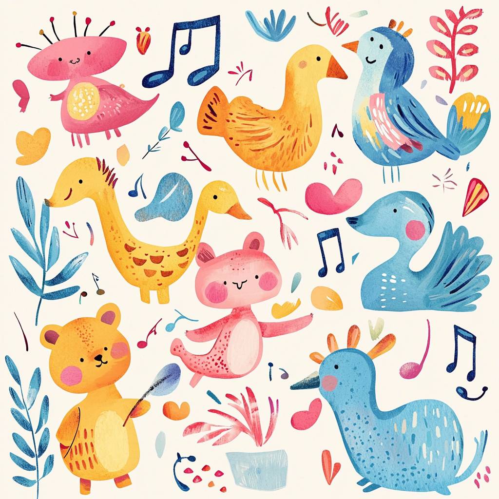 アルバムカバーは陽気な子供向けの曲スタイルで、動物、音符、明るく親しみやすい形の楽しいイラストがパステルカラーで描かれています。レイアウトは中央に配置され、アルバムタイトルには遊び心のあるフォントが使用されています。背景は柔らかい色合いで、楽しく活気のあるムードを高めます。比率は1:1に設定されており、正方形のレイアウトに適しています。
