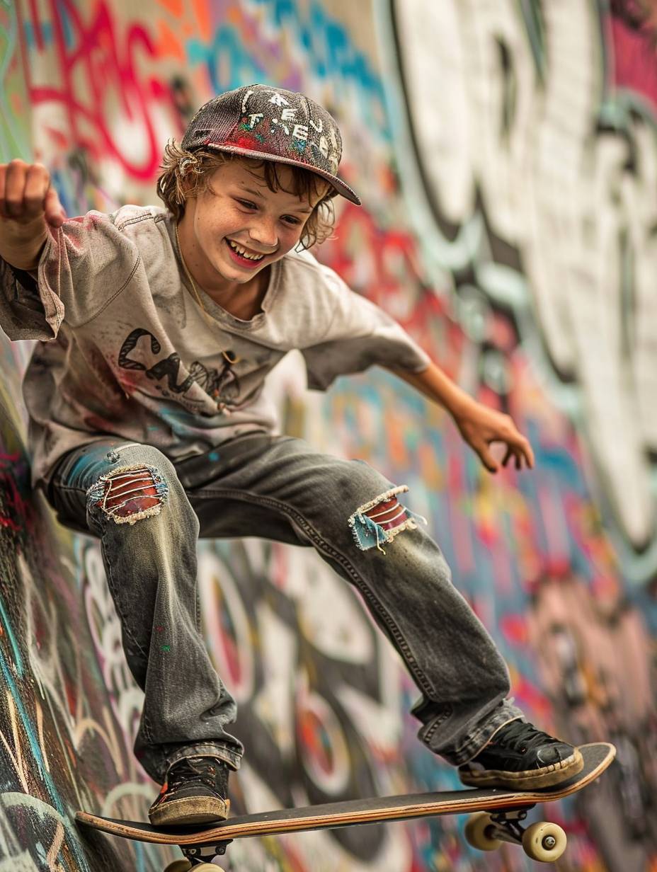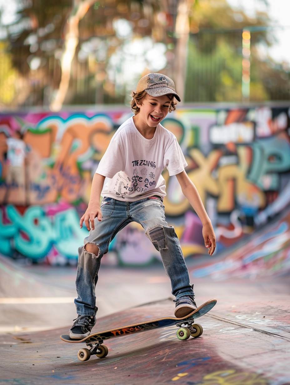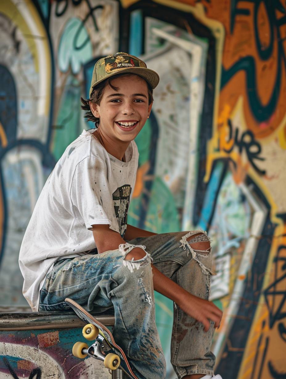 いたずらっぽい笑顔を浮かべた十代の少年が、野球帽と破れたジーンズを身に着け、落書きだらけのスケートパークでスケートボードをしている。