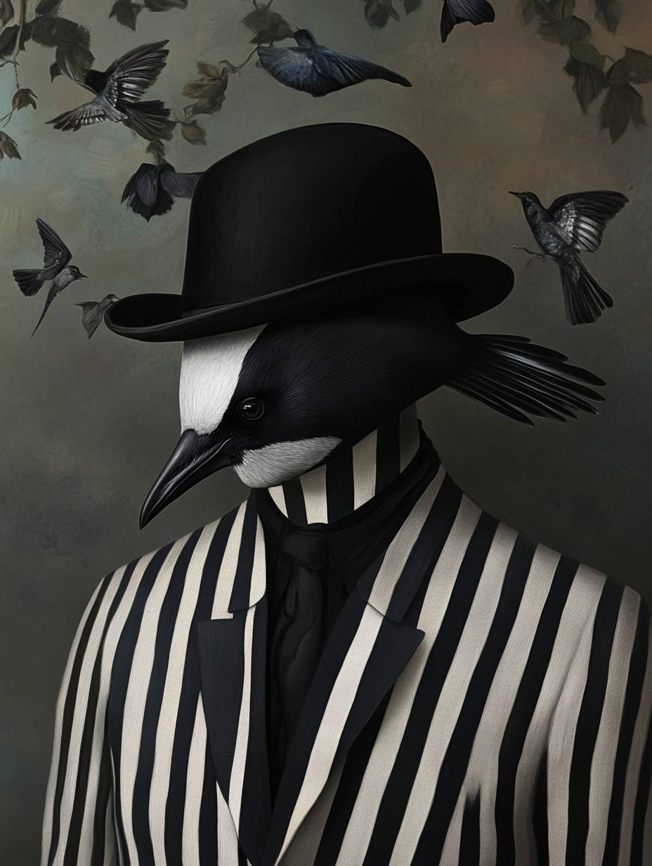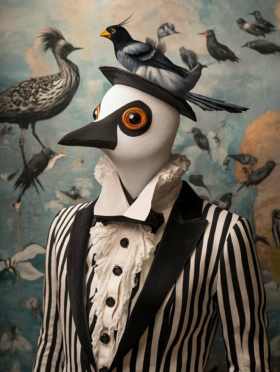 鳥のような顔を持つ男、水瓶座の冥王星、黒と白のストライプとチェックのスーツを着て、マルセル・デュシャンのスタイル、イタリアの未来主義、ハイパーリアリスティックな写真、ファリネッティのアートワークコンセプト、概念的な背景