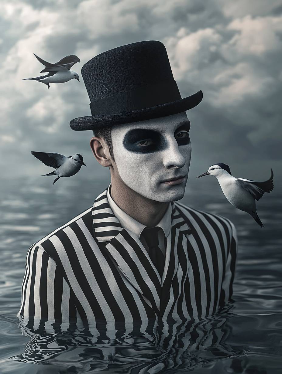 un hombre con cara de pajaro, pluton en acuario, con traje de rayas y cuadros negros y blancos , estilo Marcel duchamp , futurismo italiano, hyperrealistic photo, farinetti artwork concept, conceptual background --ar 3:4 --v 6.1