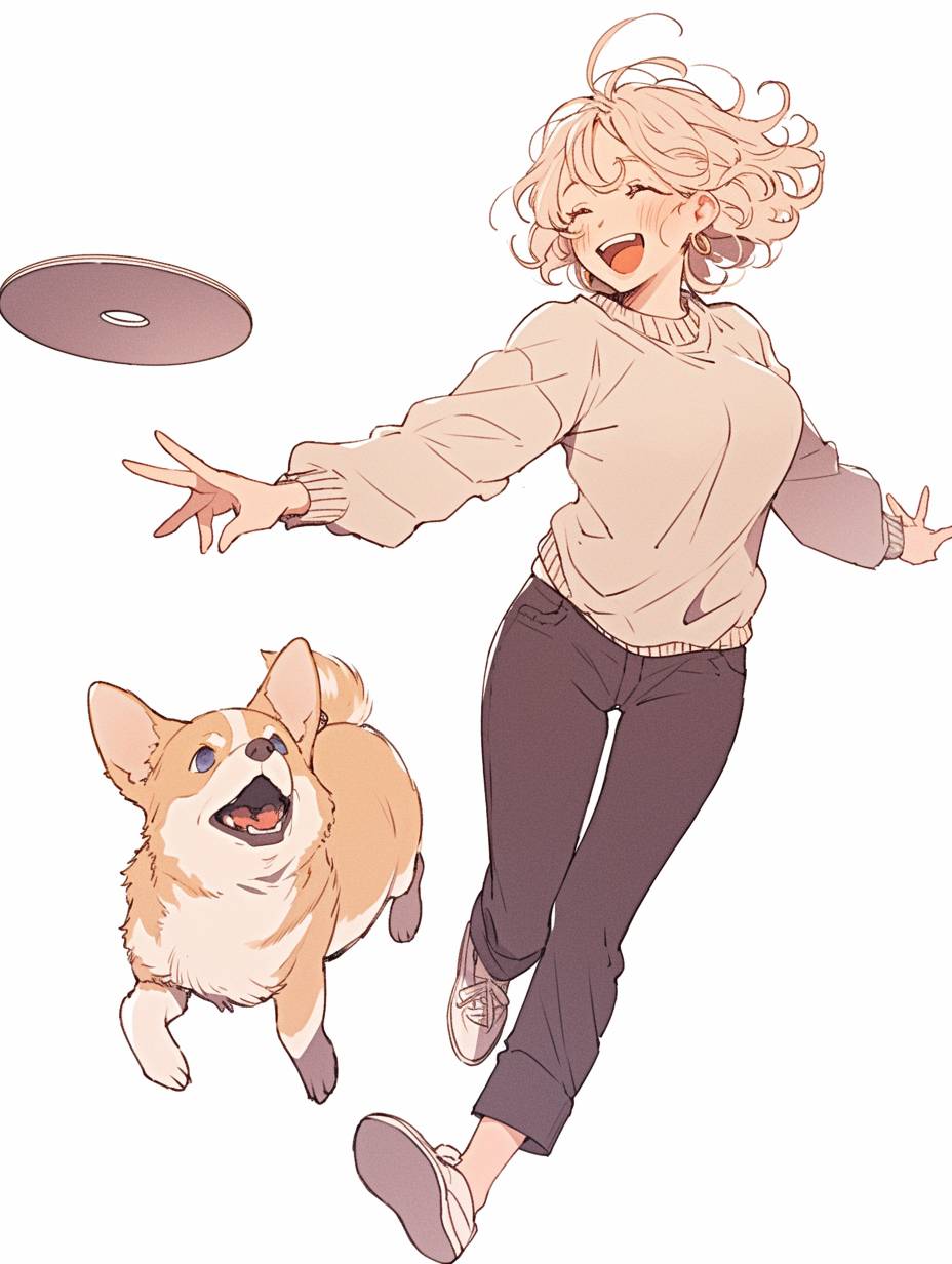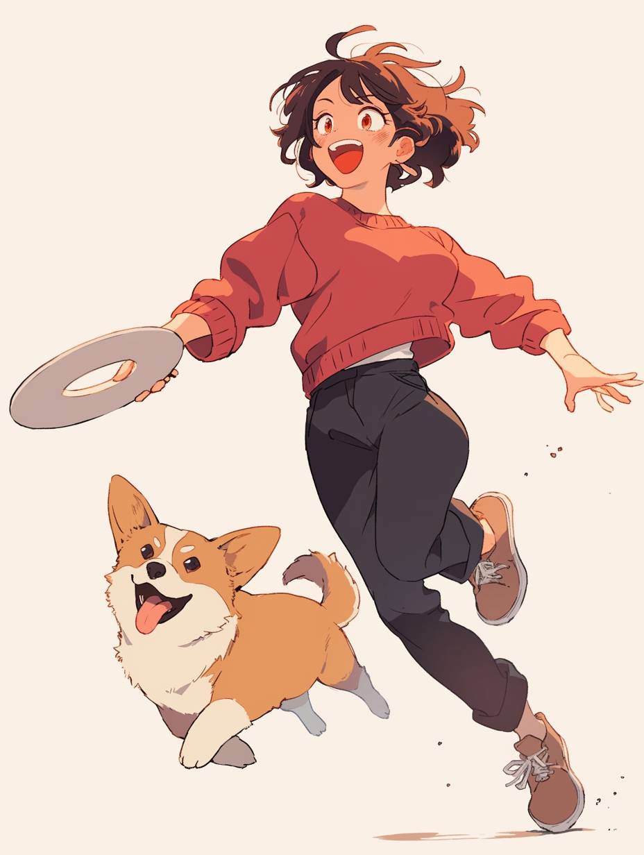 A short-haired woman, wearing a sweater and pants, taking a step, throwing a Frisbee, laughing happily, a running corgi beside her is catching the Frisbee, full body composition, front composition, illustration style --ar 3:4 --niji 6