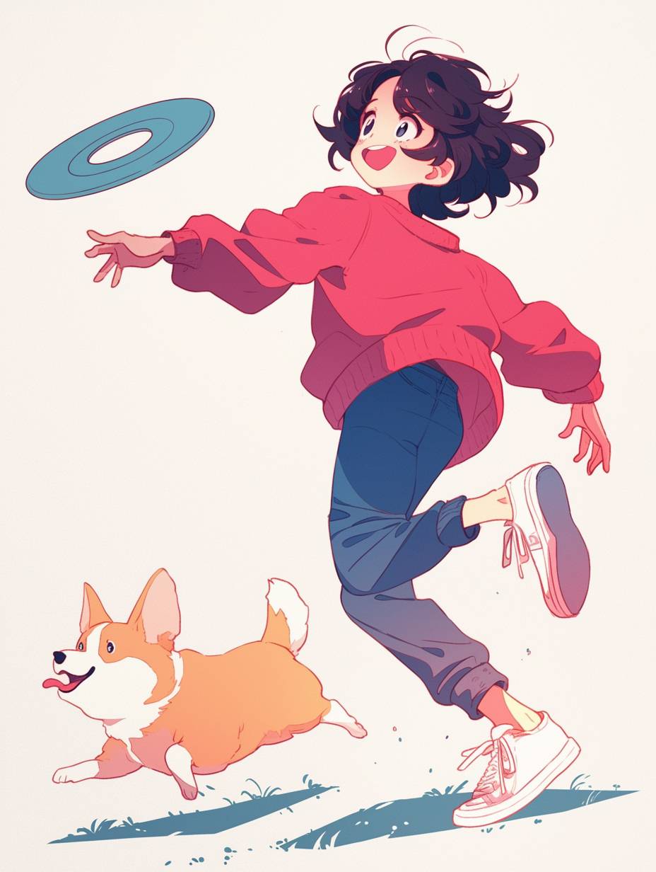 短髪の女性がセーターとパンツを着て、一歩踏み出し、フリスビーを投げ、楽しそうに笑っている。彼女の横にはフリスビーを追いかける走っているコーギーがいる。全身の構図、正面の構図、イラストスタイル