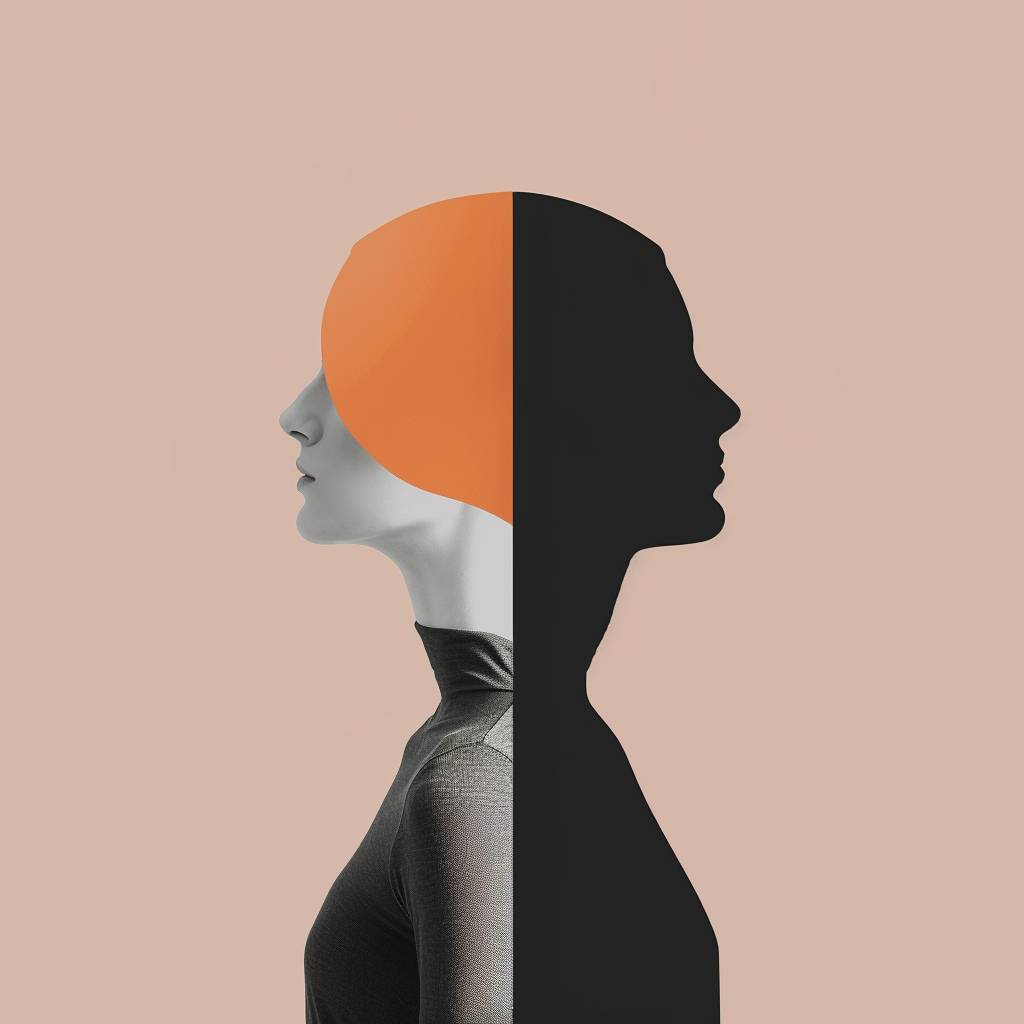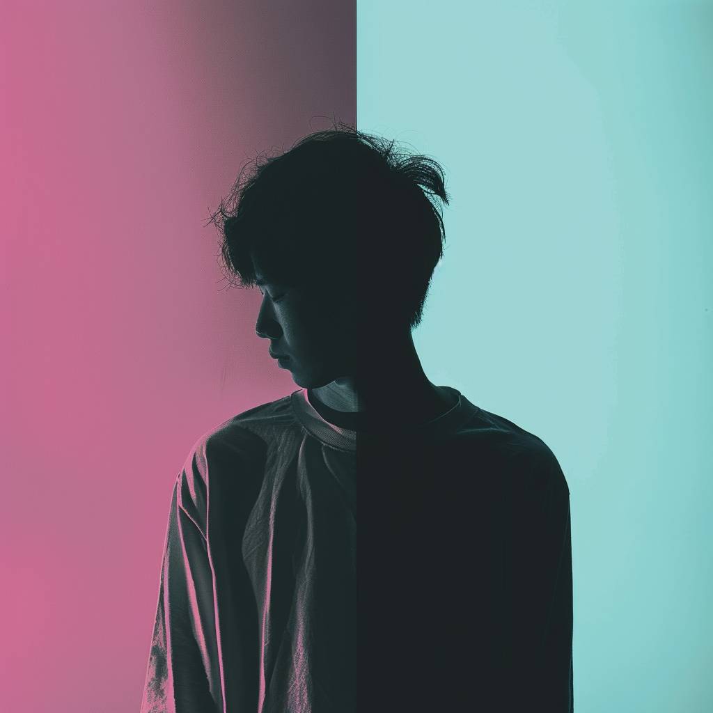 ミニマリストの画像で、左側に[COLOR-1]、右側に[COLOR-2]の2色で分割された画面が特徴です。中央には[SUBJECT]がミニマルに描かれています。[SUBJECT]の左側の部分は右背景の[COLOR-2]で、右側の部分は左背景の[COLOR-1]で描かれています。画像は現代的かつ抽象的で、[COLOR-1]と[COLOR-2]の2色のみを使用しています。