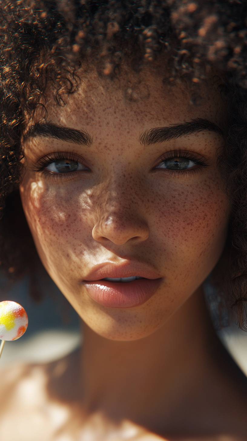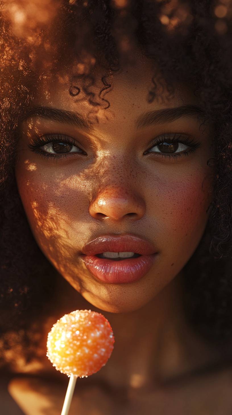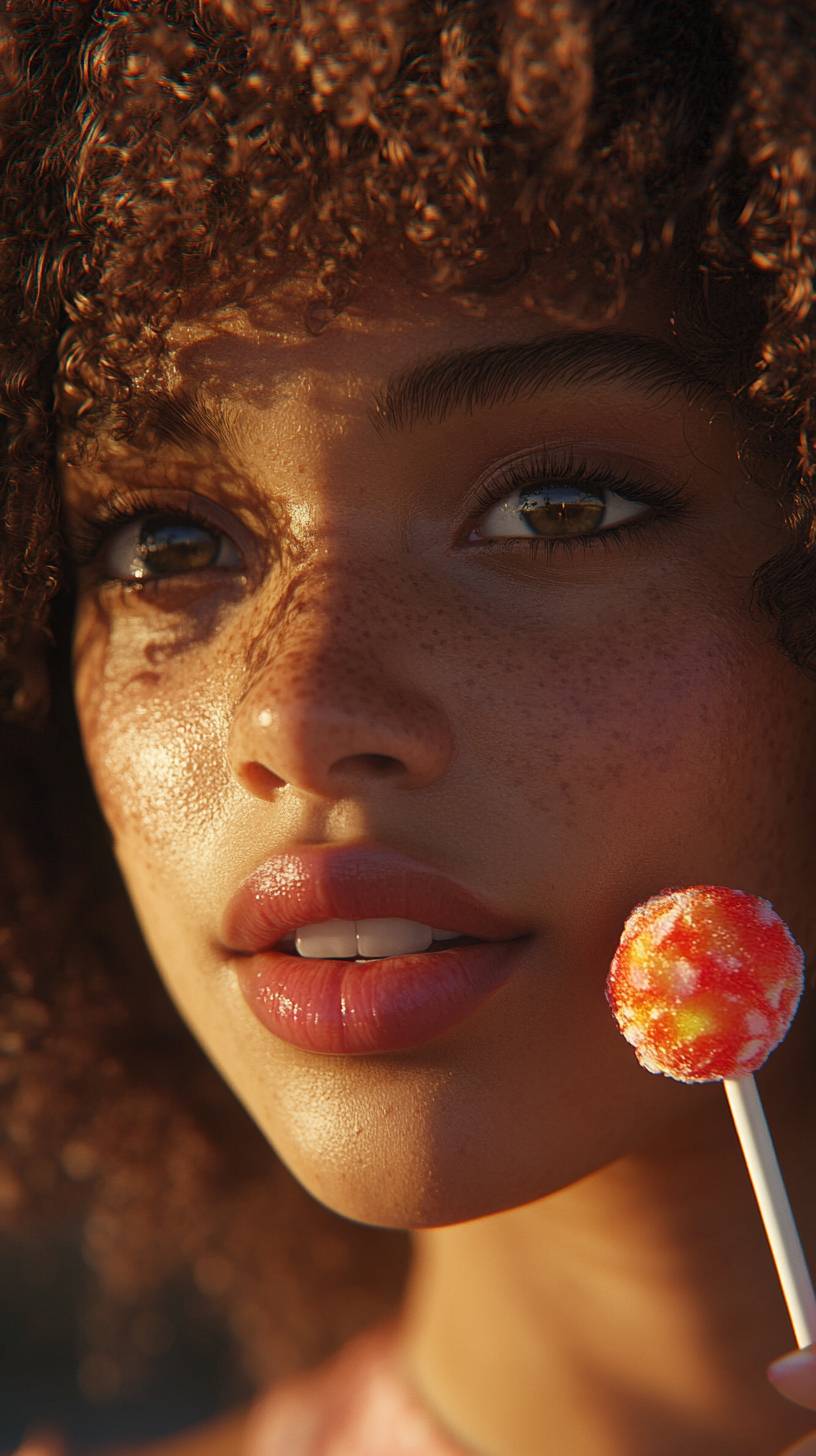 日差しの中でロリポップを持つ30代後半のライトスキンの黒人女性のクローズアップ。