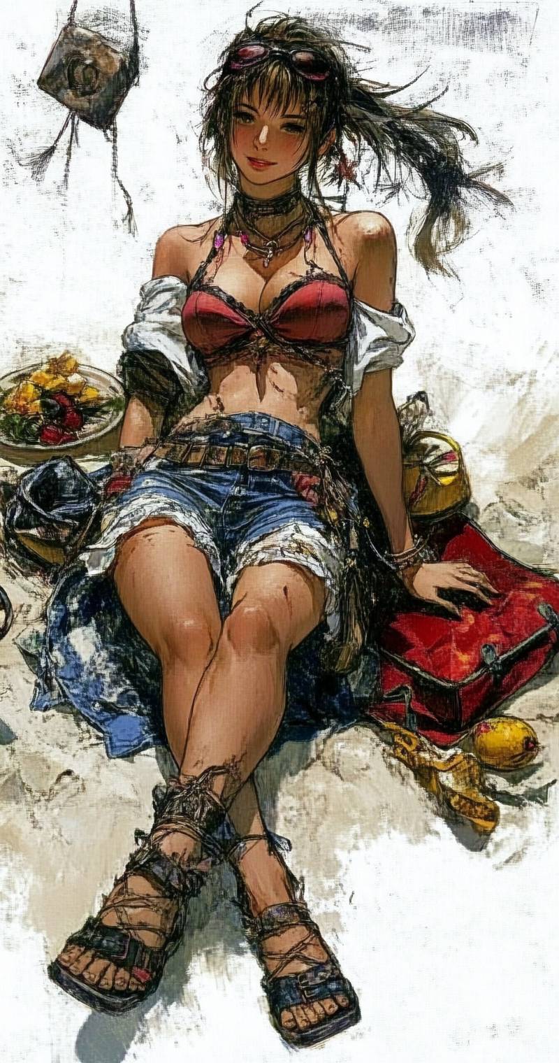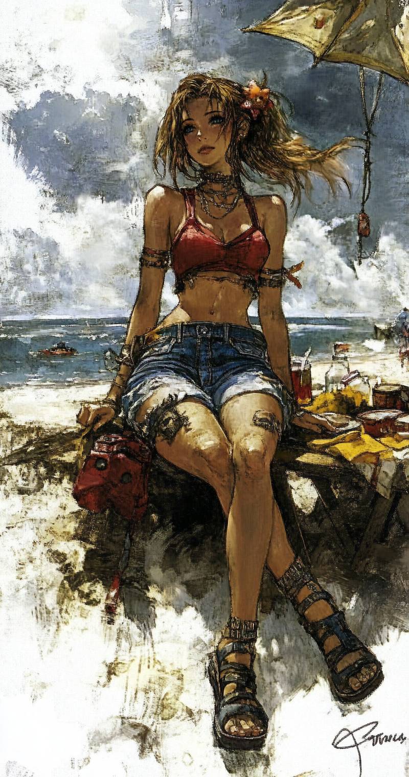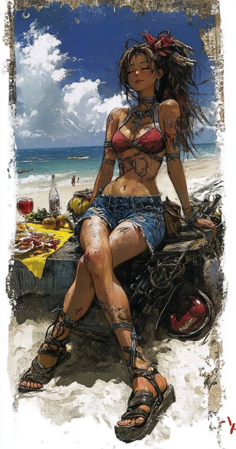 夏のリラックスしたアニメの女の子が、タンクトップにデニムスカート、ビーチサンダルを履いてビーチサイドでピクニックを楽しんでいる。