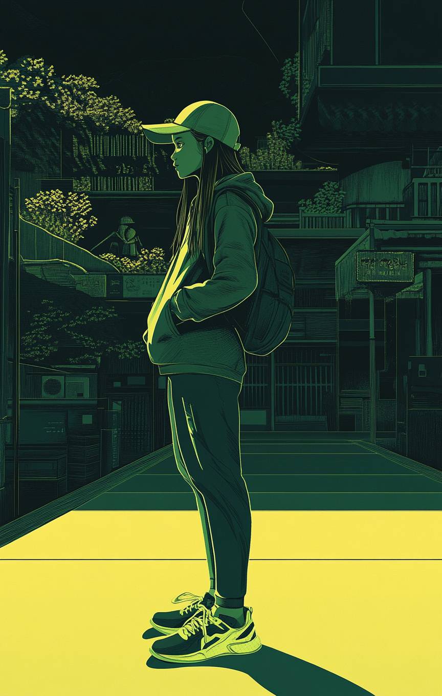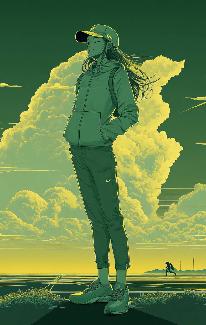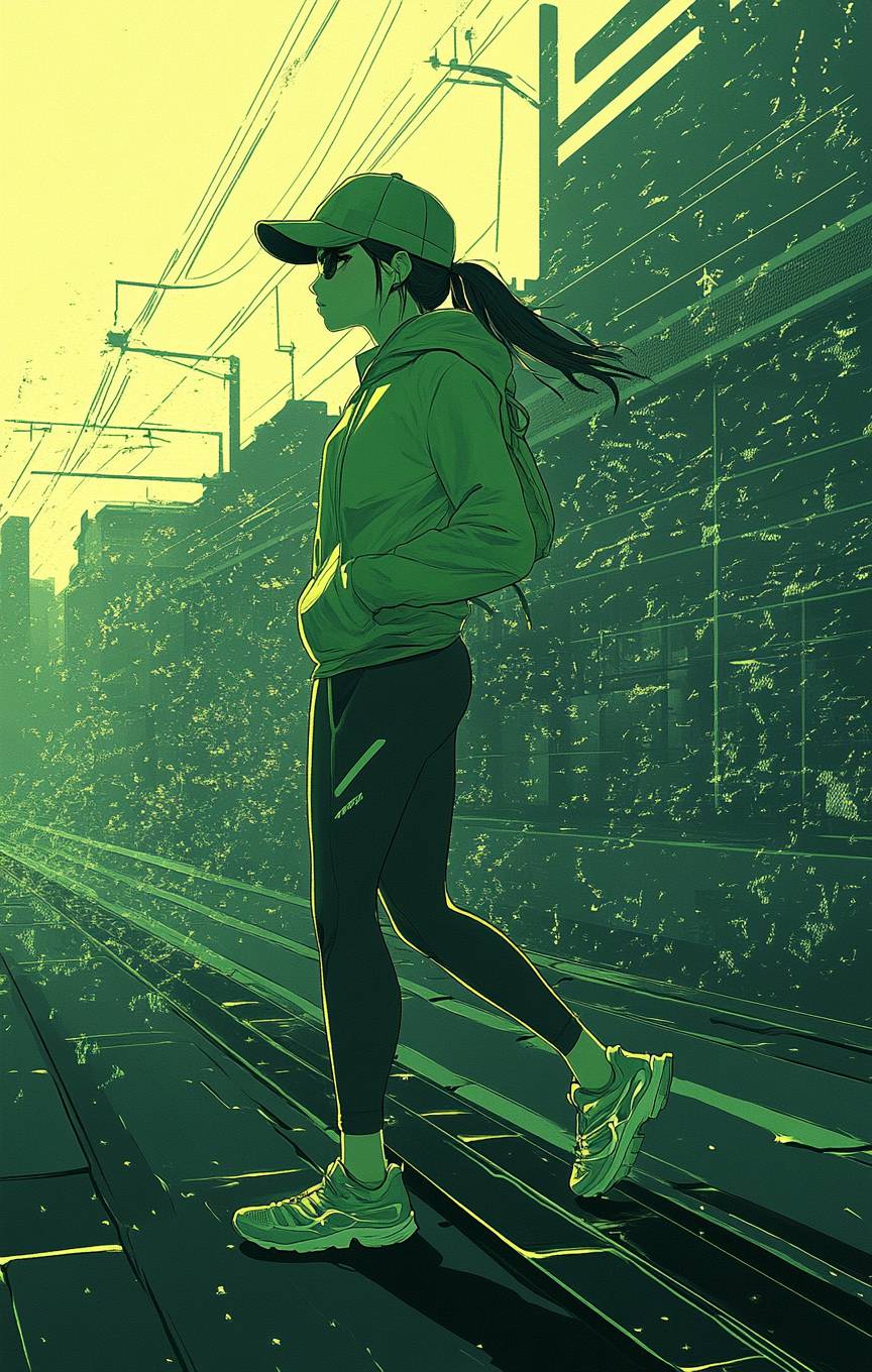 アクティブでシックなアニメの女の子が、ジョガーパンツ、オーバーサイズのパーカー、キャップ、ランニングシューズを着て、朝のジョギングをしています。