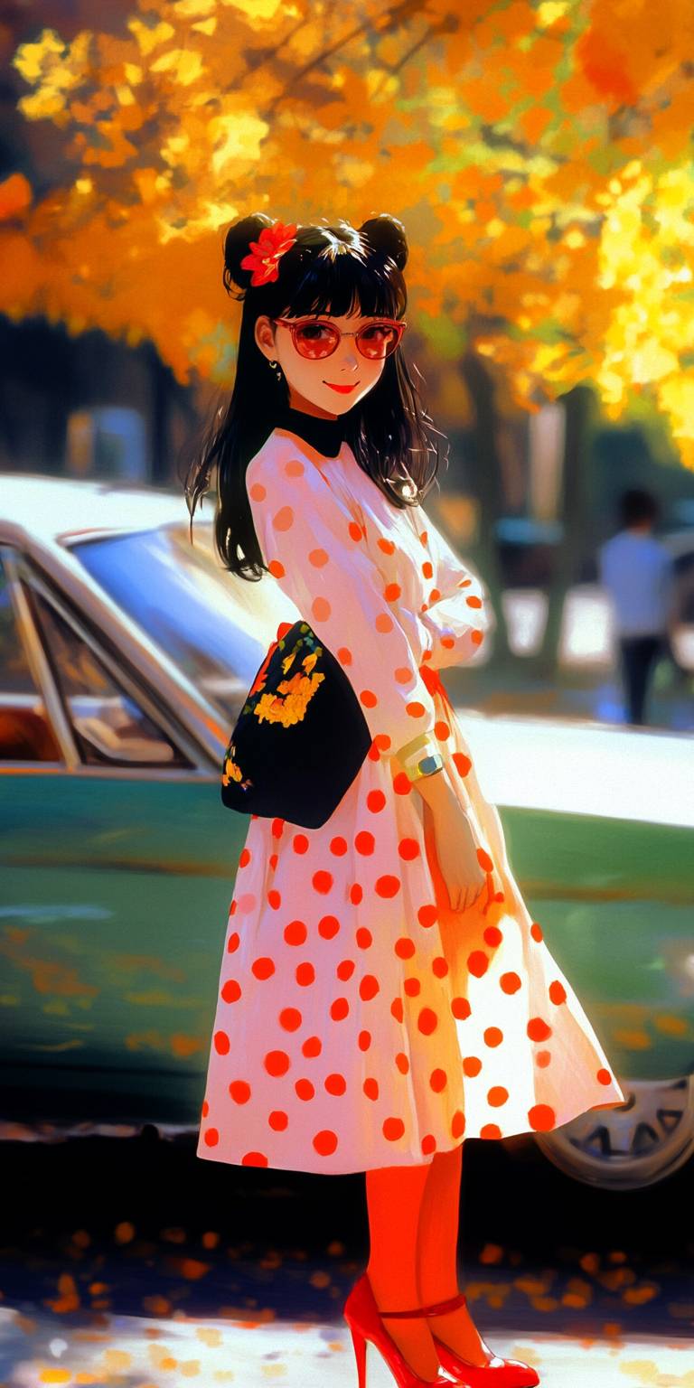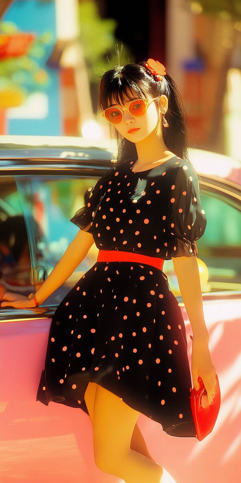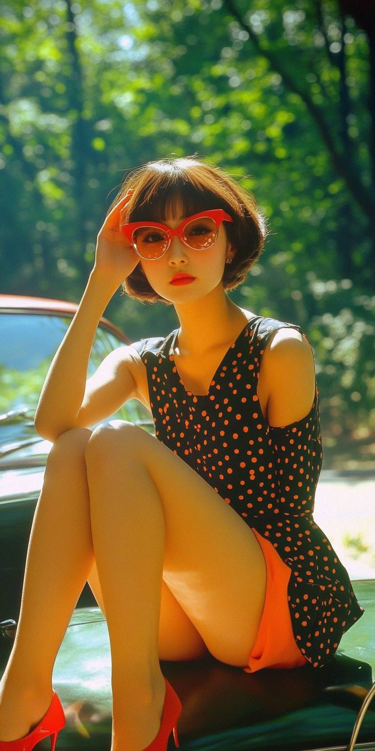 アニメの女の子、レトロなカジュアル、ドット柄のドレス、赤いフラットシューズ、キャットアイサングラス、ヴィンテージカーの背景。