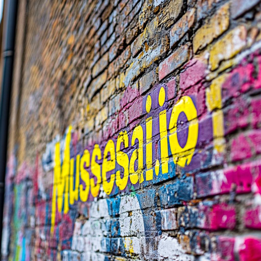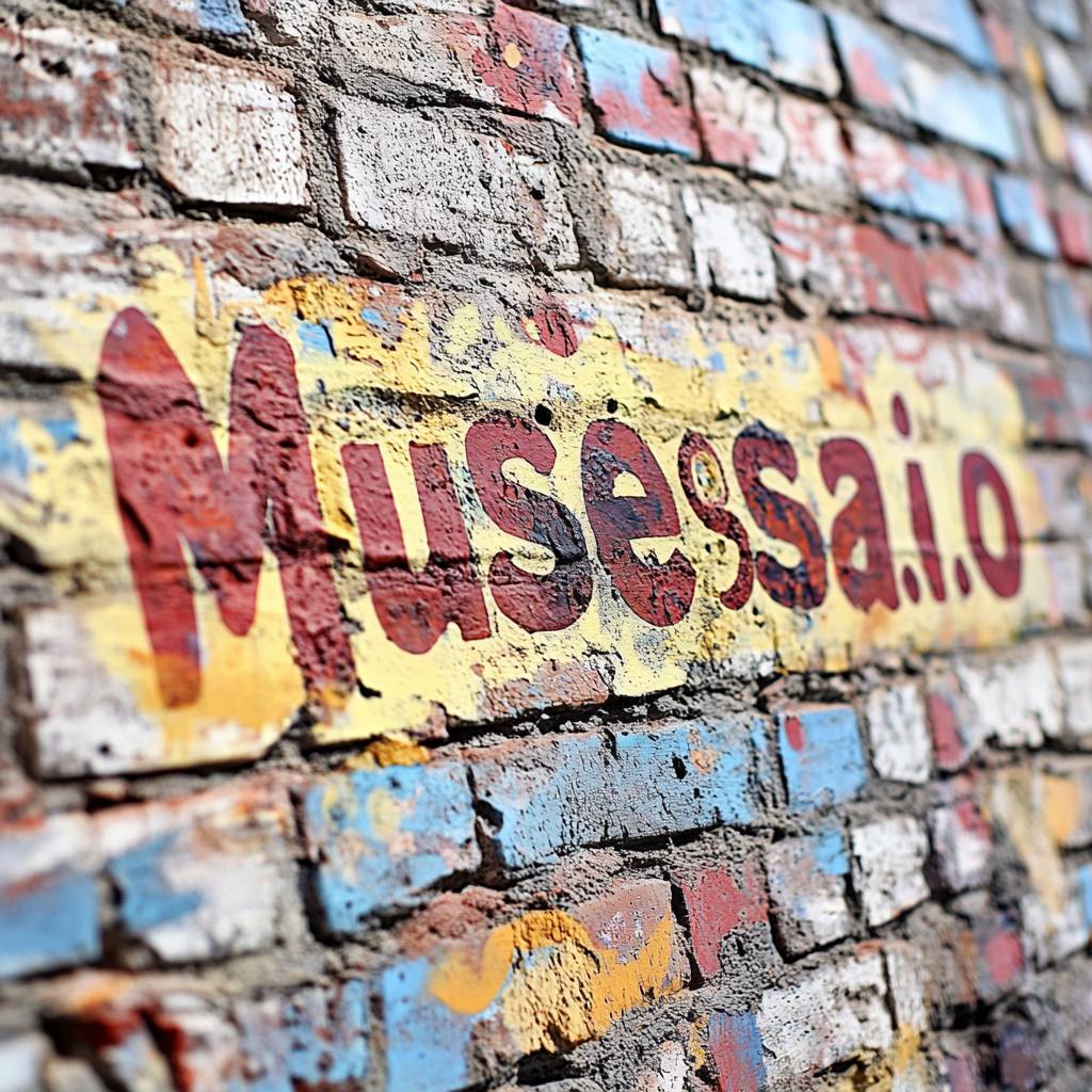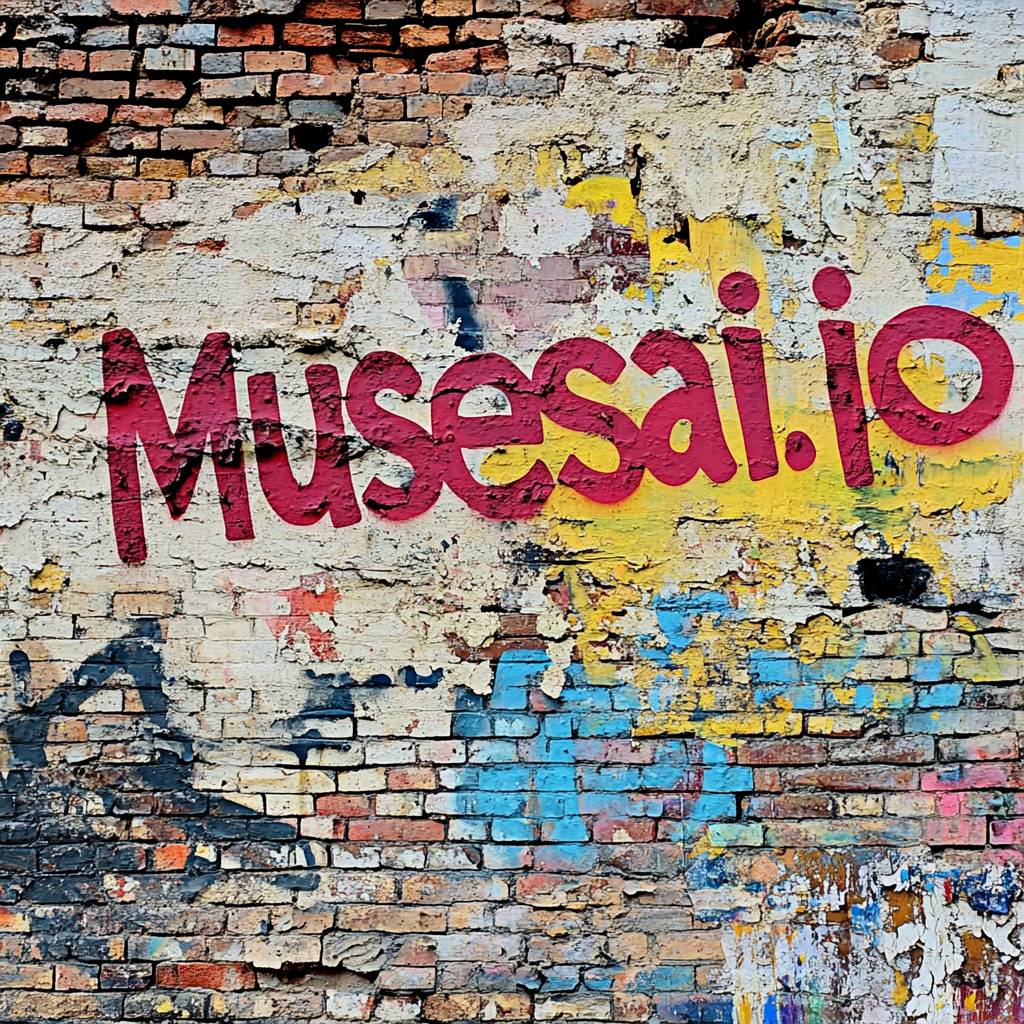 古いレンガの壁にカラフルなグラフィティアートがあり、スプレーペイントで書かれた「Musesai.io」という言葉が特徴です。
