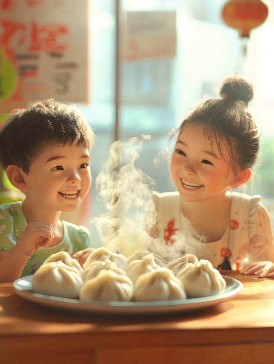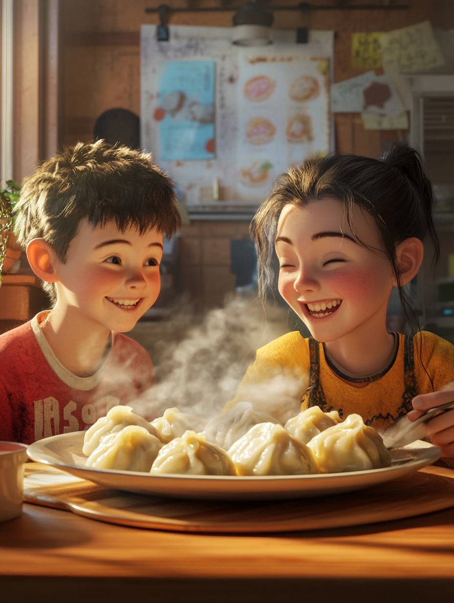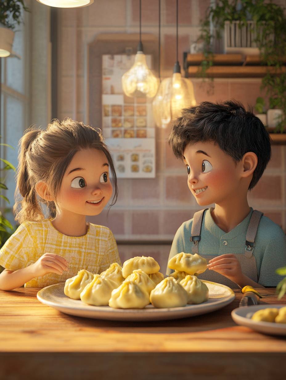 男の子と女の子が、温かく蒸気の立ち上る餃子の皿を楽しそうに見つめる、詳細で未来的な3Dアートシーンです。