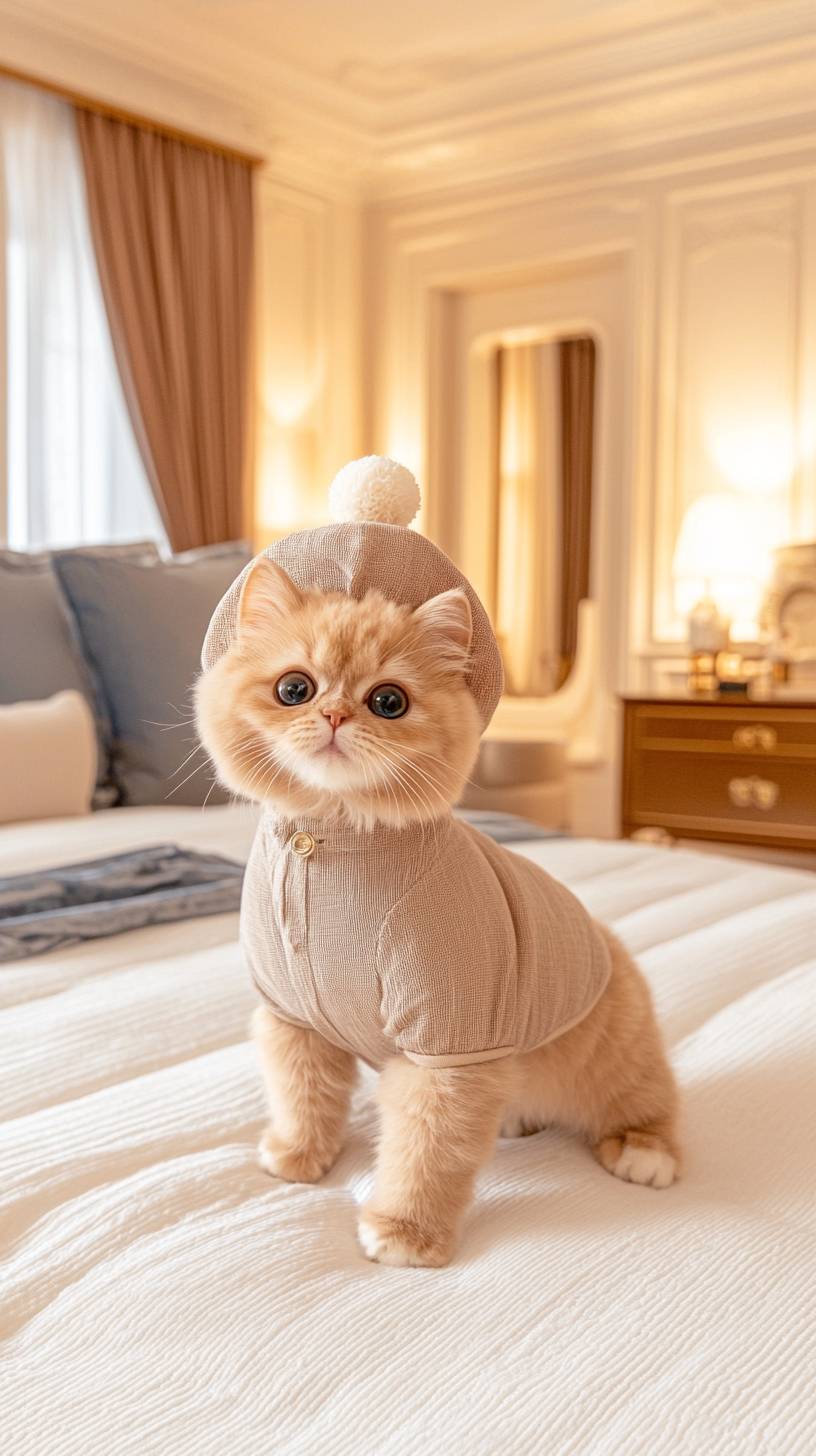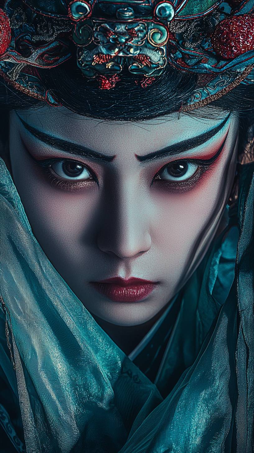 伝統的な北京オペラの衣装を着たかわいい猫が、精巧なメイクとカラフルなヘッドドレスで、魅力と遊び心を漂わせています。