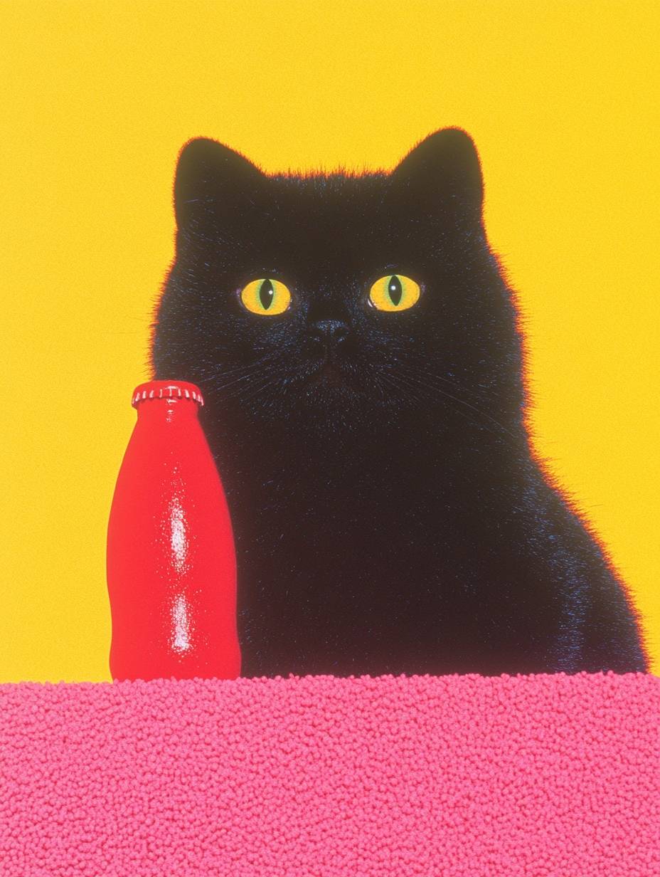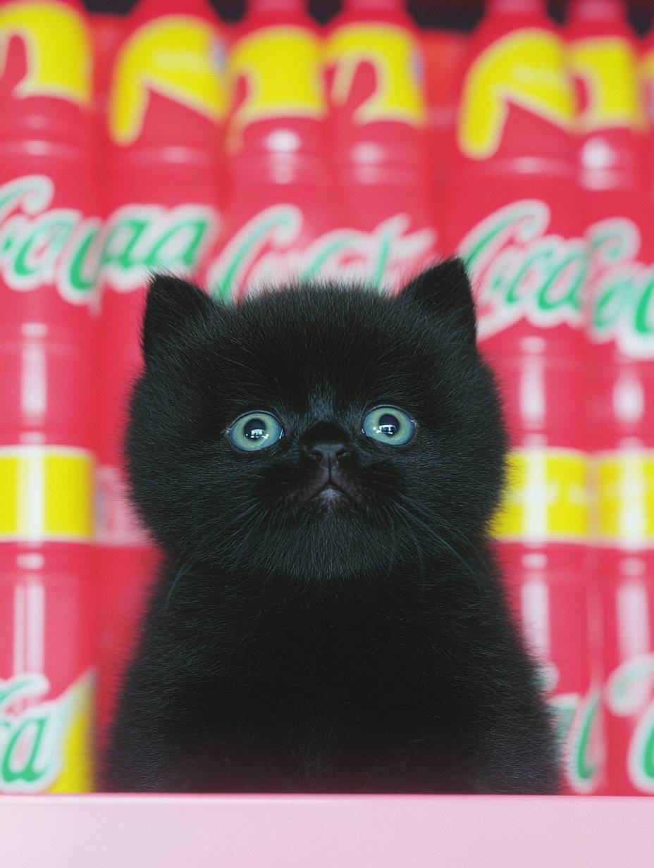 A cute soft black kitten having a A bottle of Coca Cola in a store, most detailed, 8k --ar 3:4 --style raw --sref 680572301 --personalize kzilt9y --stylize 950 --v 6.1