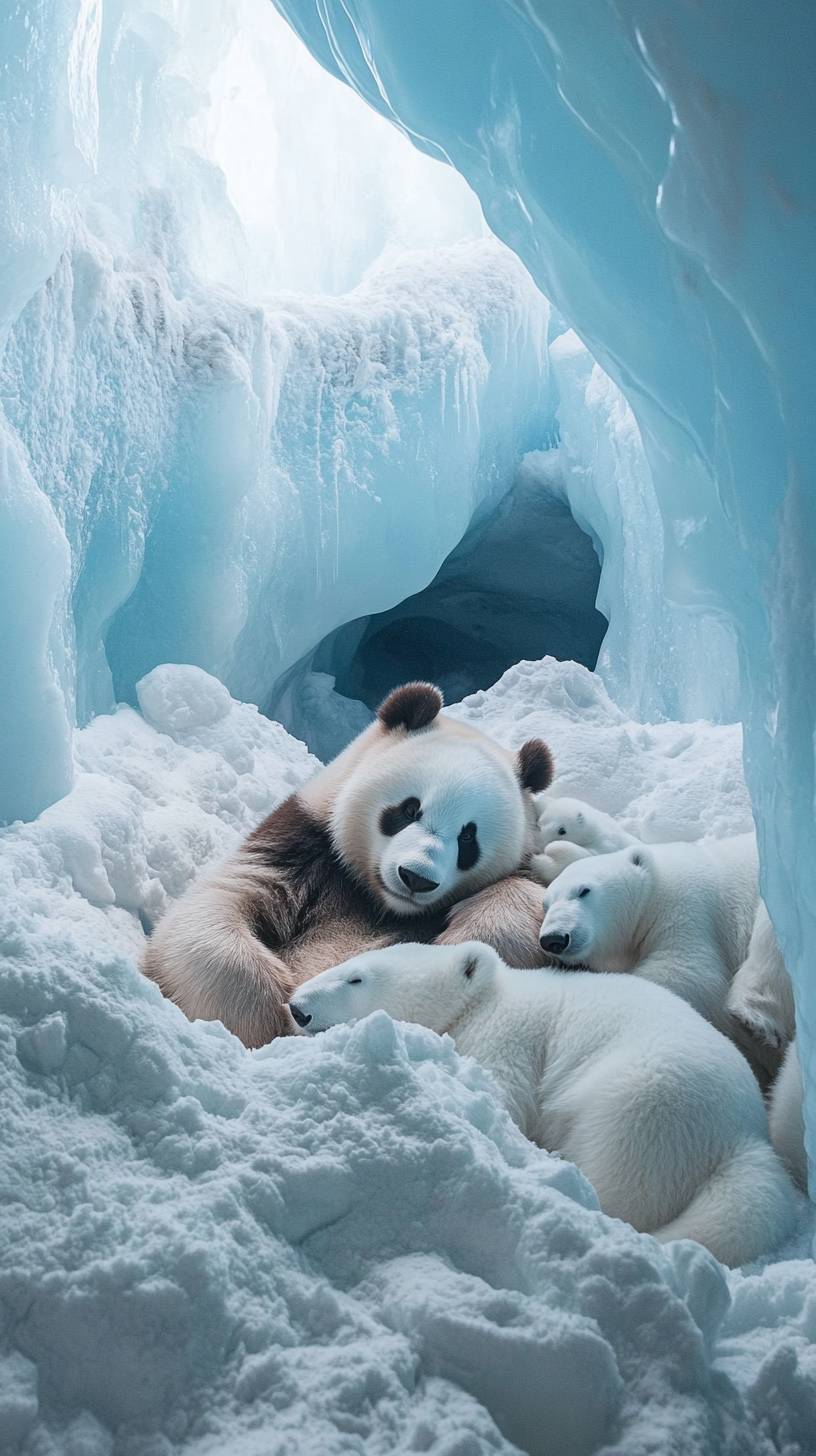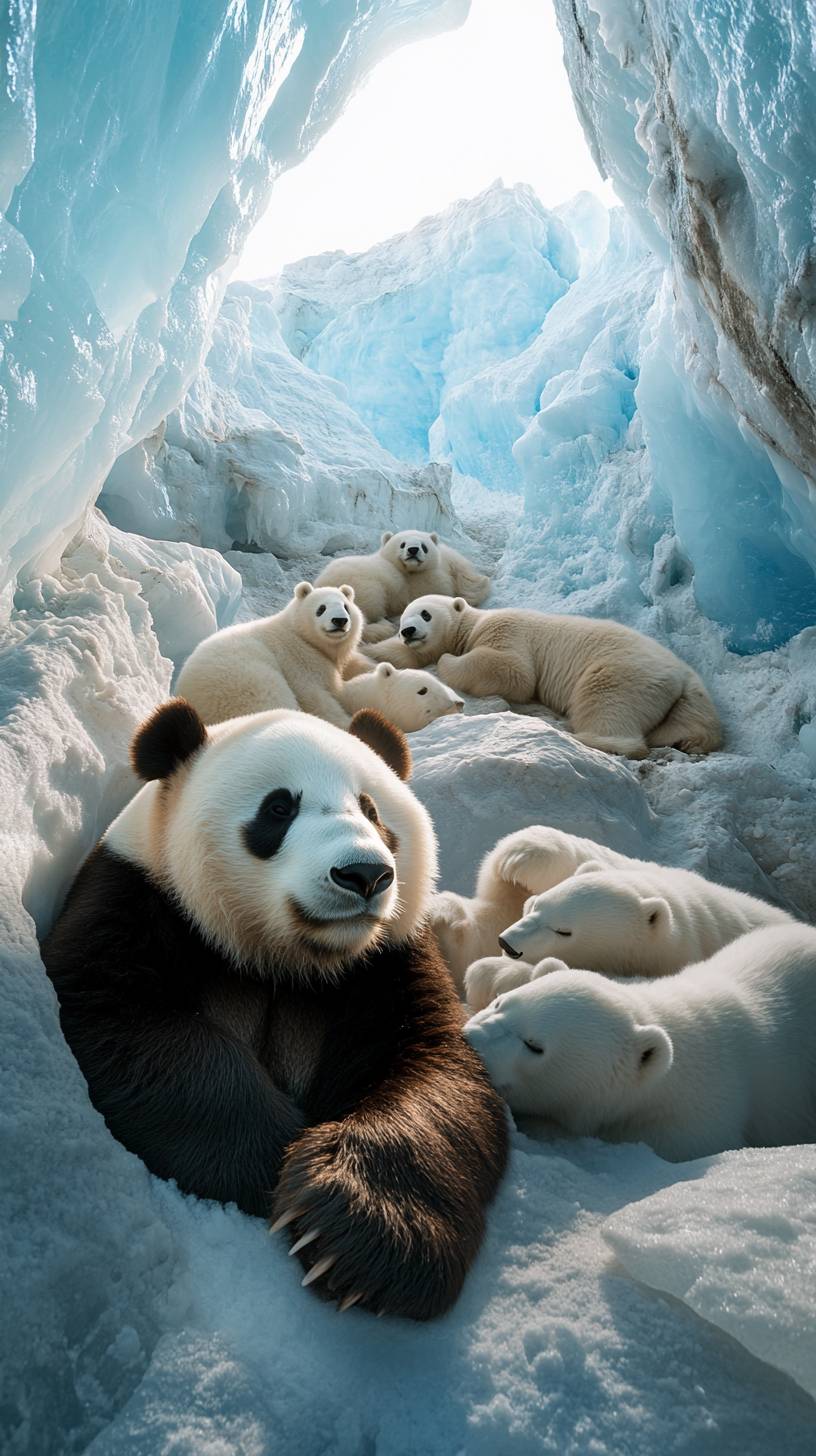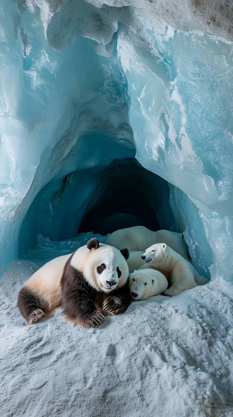 A surreal, hyper-realistic image of a panda and a group of polar bears resting by an ice cave. The panda sits comfortably, leaning against the icy walls, while the polar bears lay nearby, gazing out into the snowy landscape. The cave’s soft, blue hues and the shimmering light give the scene a calming, dreamlike atmosphere. Shot by Annie Leibovitz --ar 9:16 --style raw --personalize u3exi79 --v 6.1