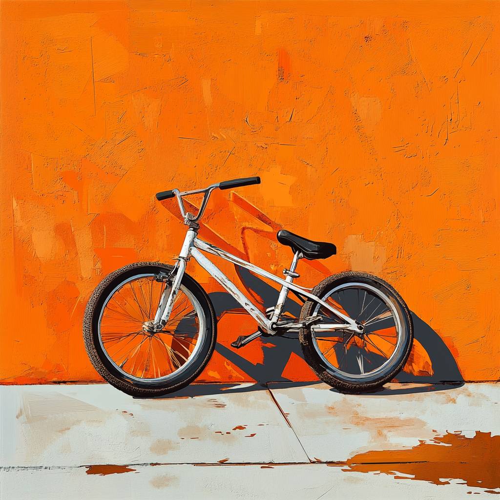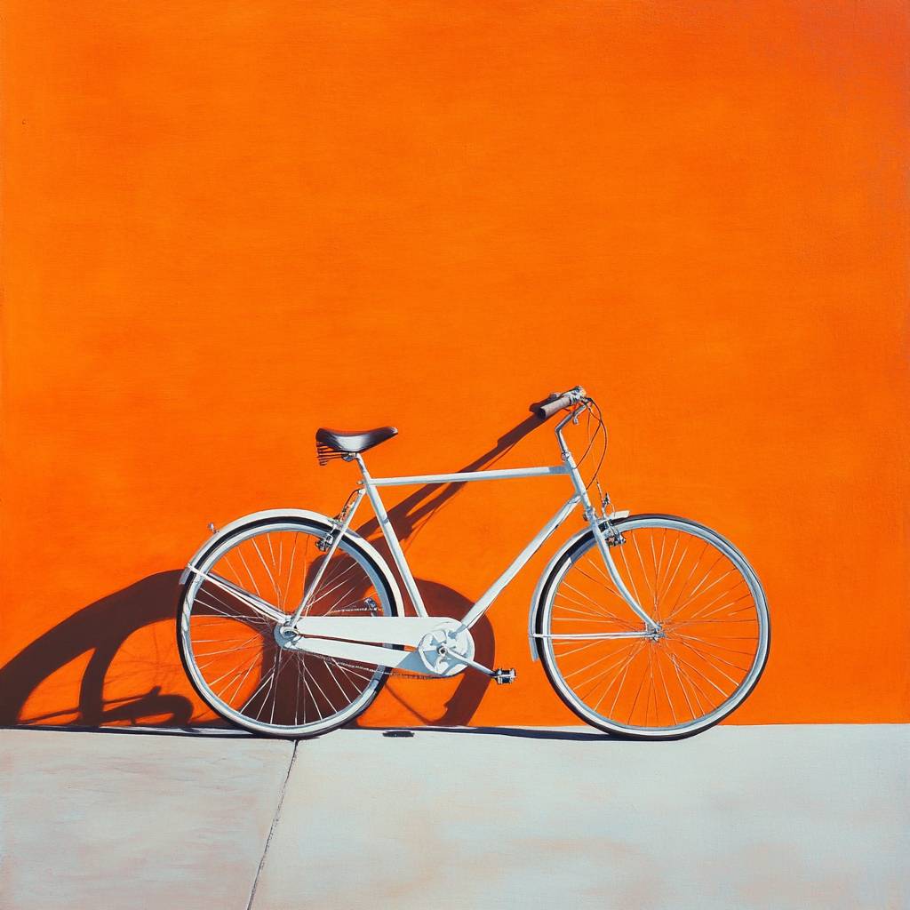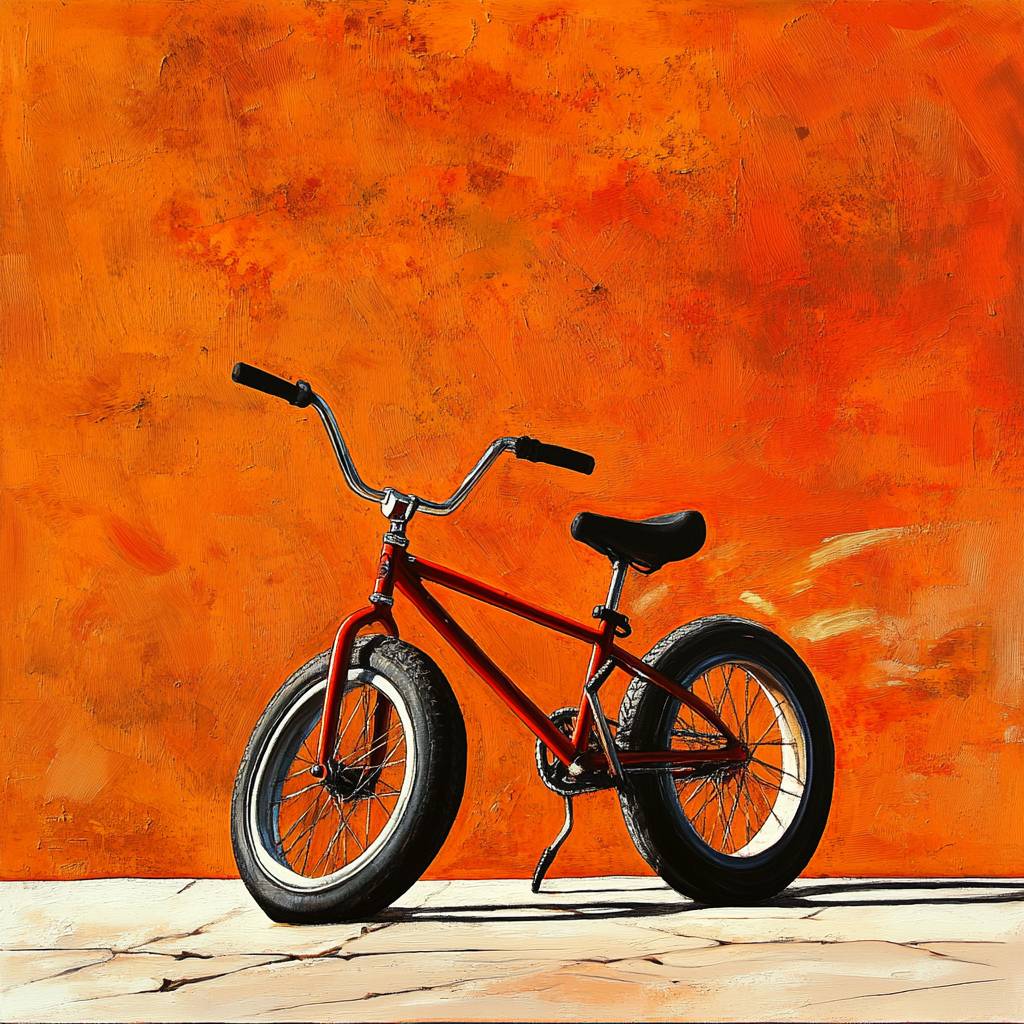 ハイパーリアリスティックスタイルの自転車、車輪が斜め、オレンジの背景の壁。