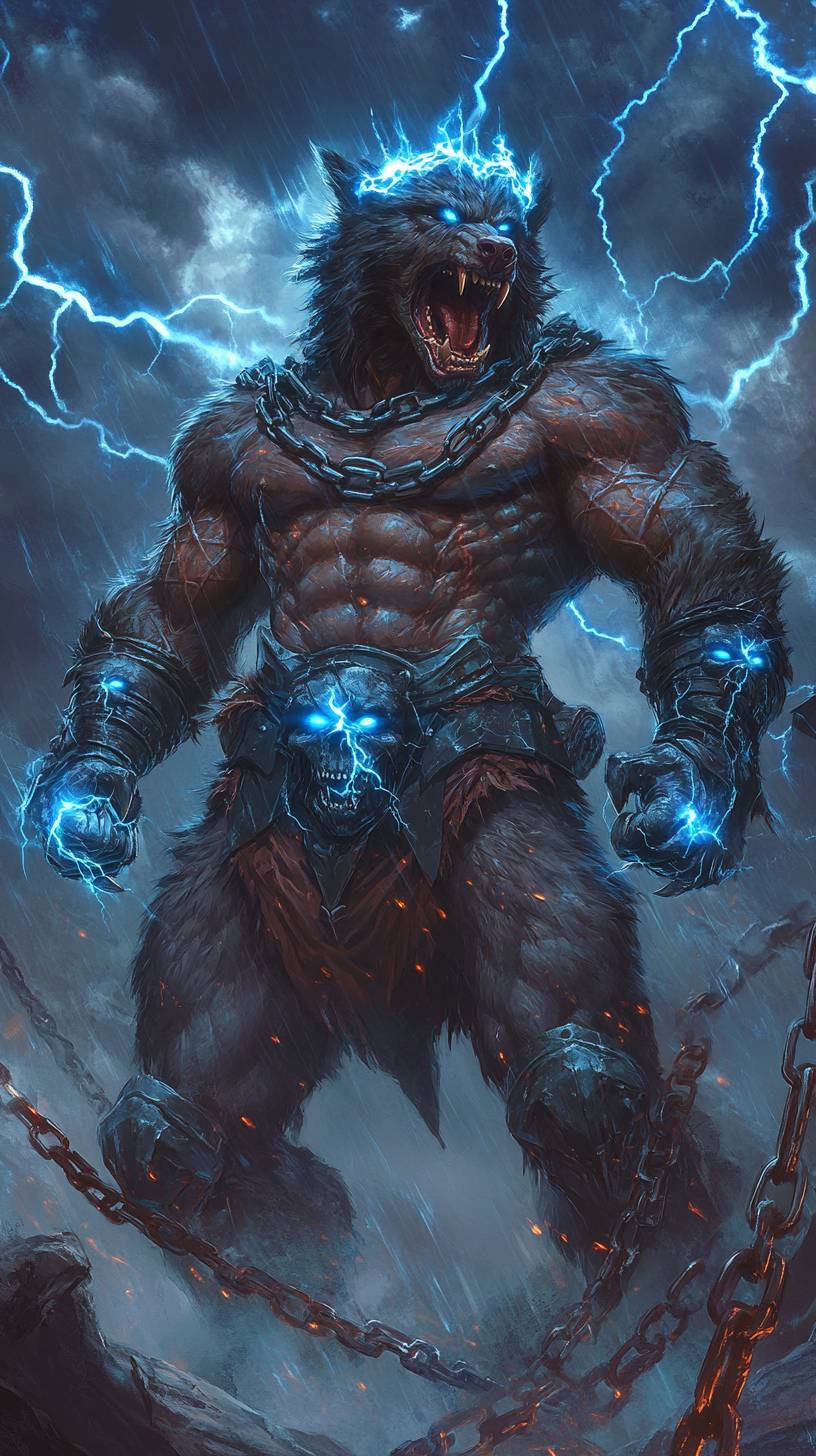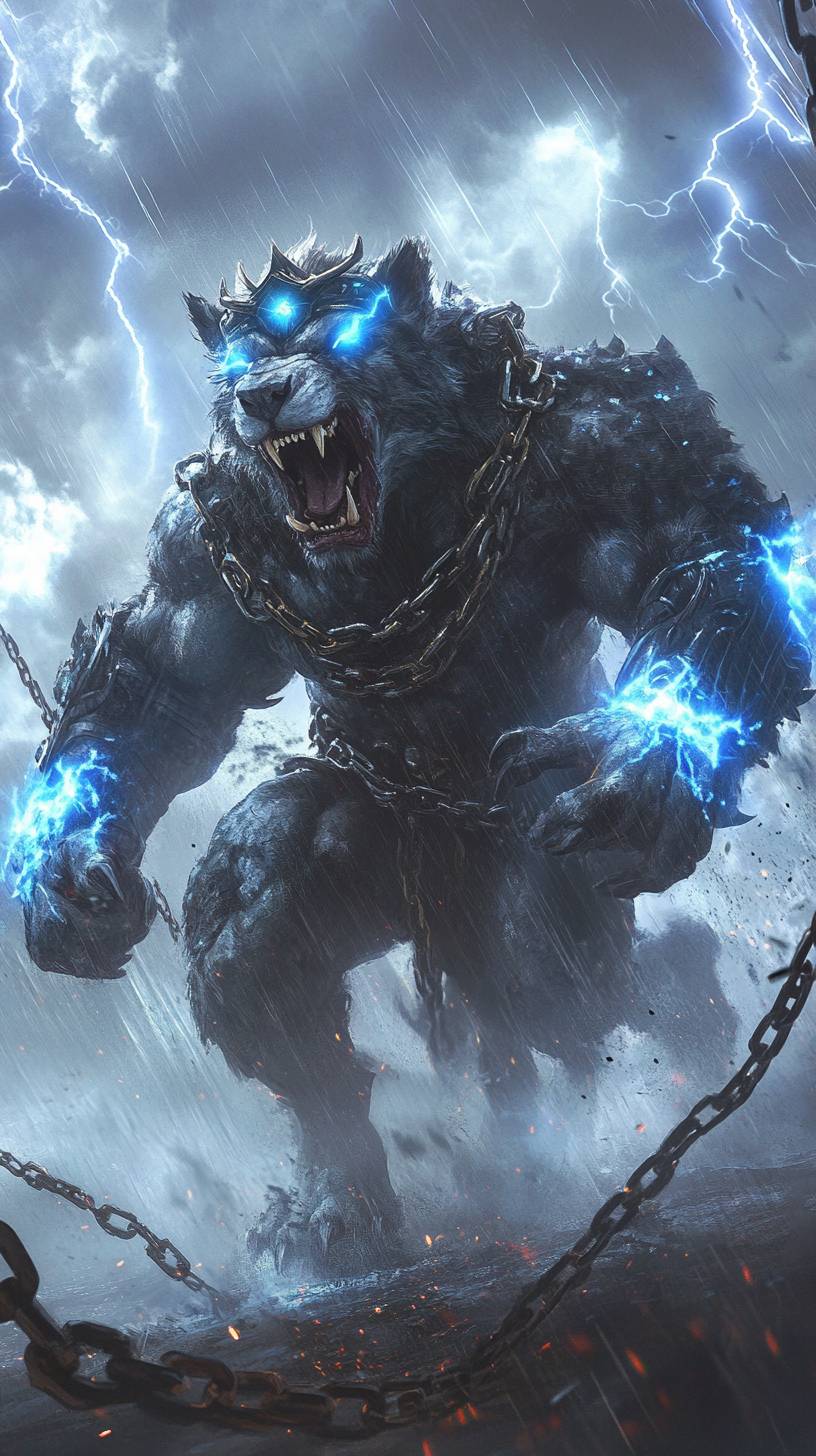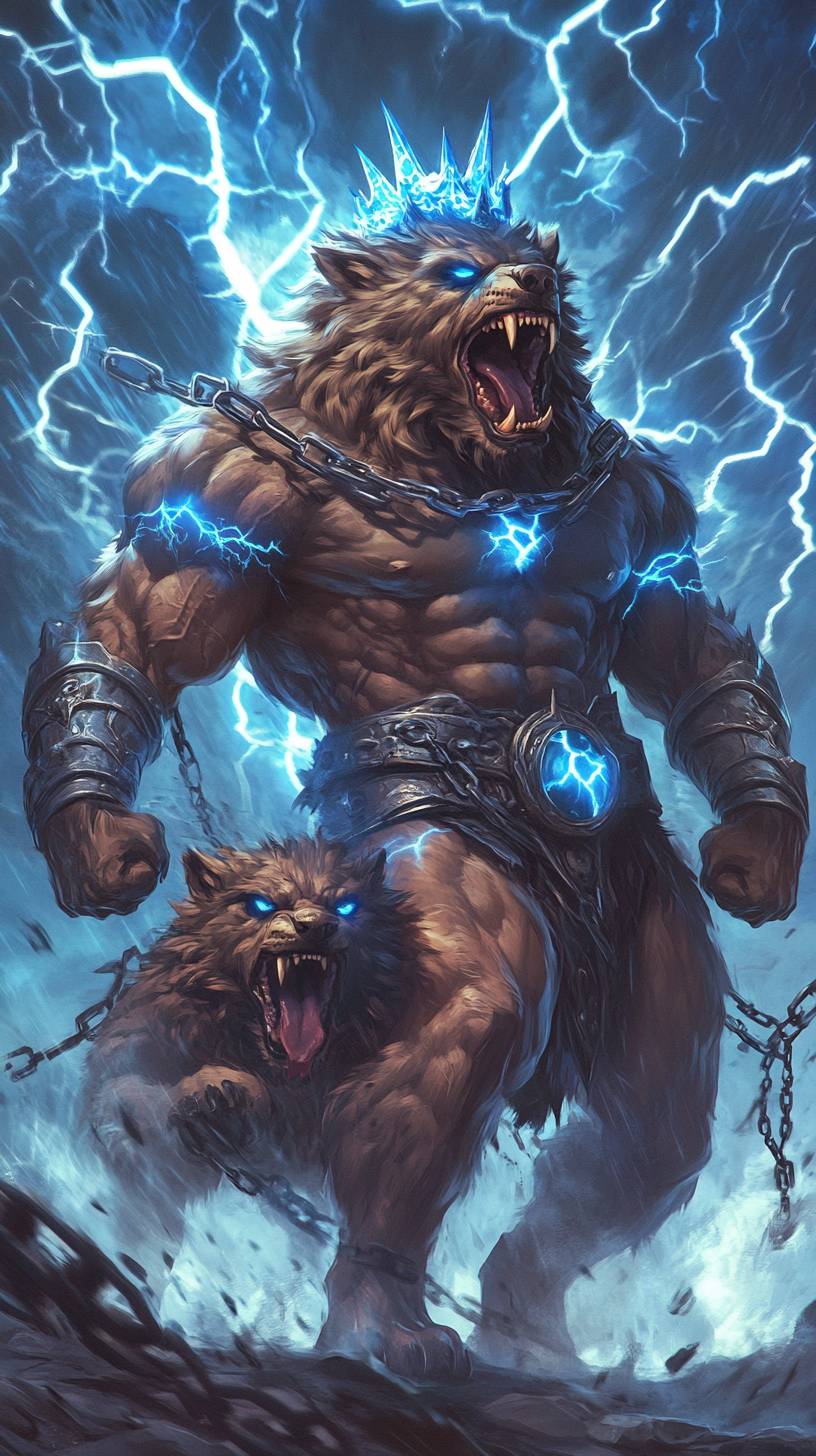 ゼウスとケルベロスのハイブリッド - この強力な生物は、ゼウスの力強く筋肉質な上半身に稲妻の冠を飾り、下半身は三頭の甲冑を着たケルベロスです。それぞれの頭は電気の青い目で唸りを上げ、雷鳴がその間で轟きます。鎖が獣を囲み、荒れた風景を prowling しながら、歩くたびに震動を引き起こし、恐ろしい強さで神聖な領域を守っています。