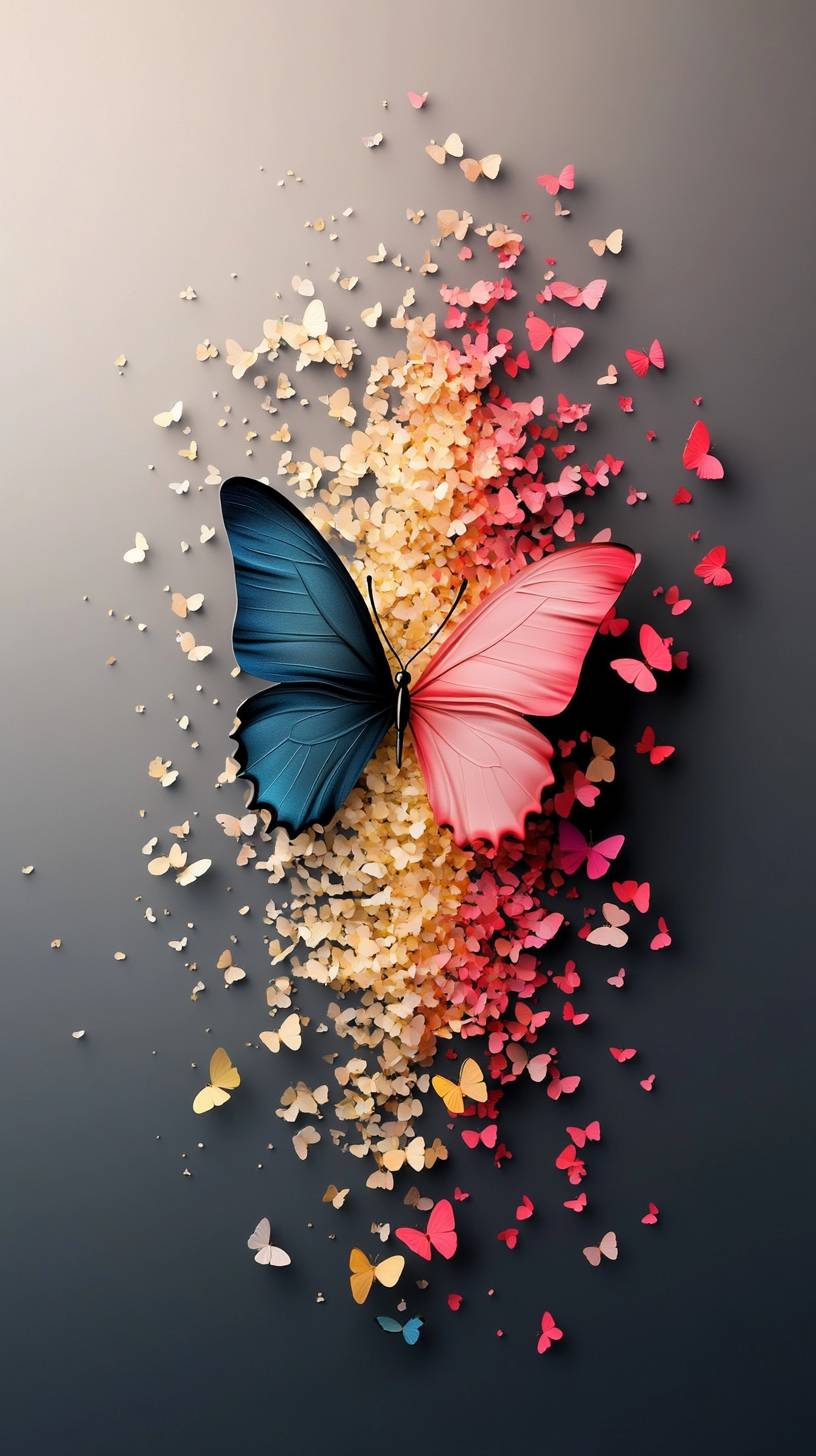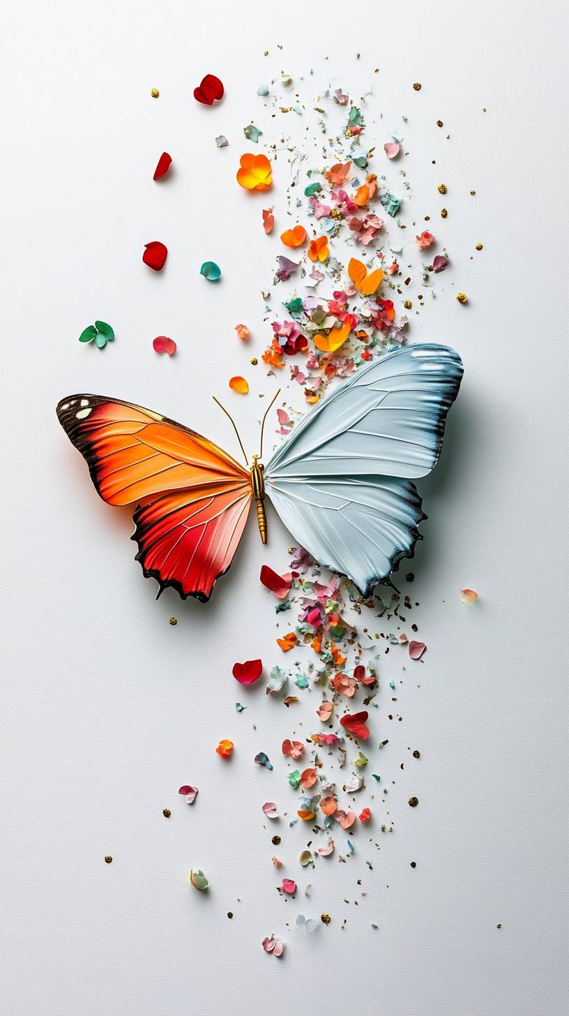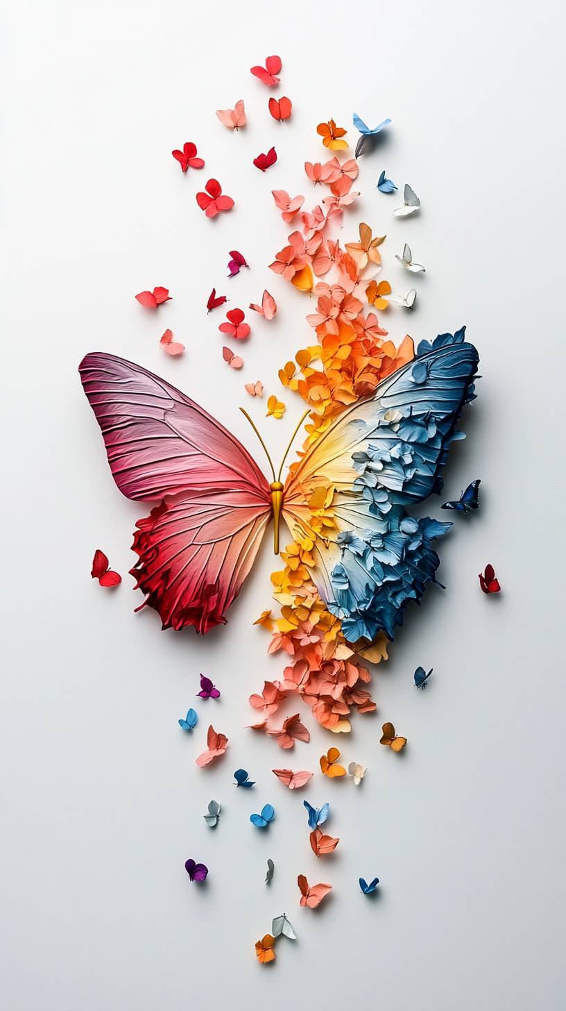 花びらで作られたカラフルな蝶々が、中央に黒い金のラインで仕切られ、ミニマルな3Dスタイルです。