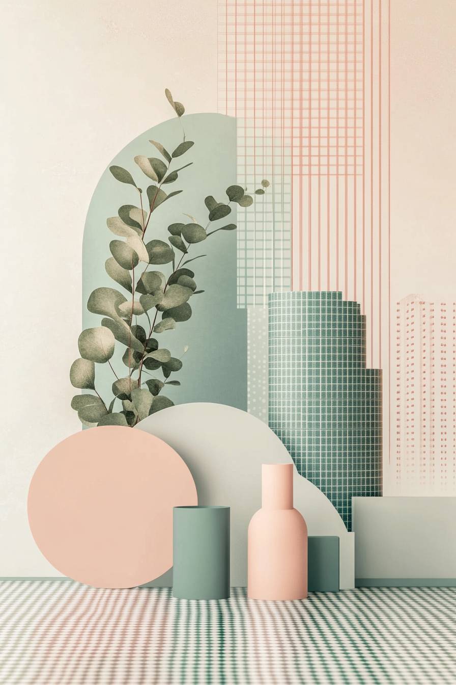 柔らかいパステルカラーの背景に幾何学的な形やボヘミアンパターン、ユーカリの葉が含まれるデザインで、現代的で温かみのある美しさを提供します。