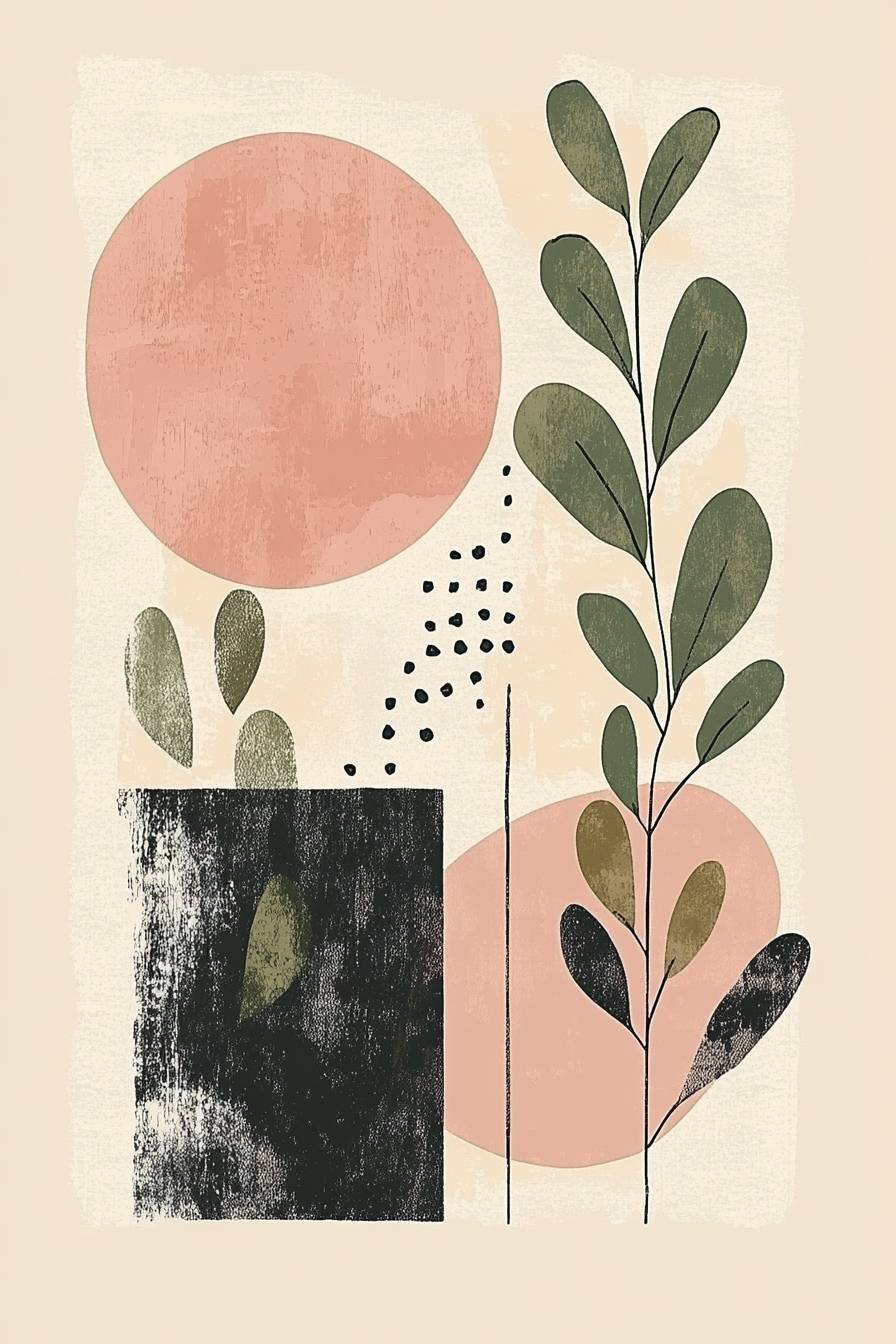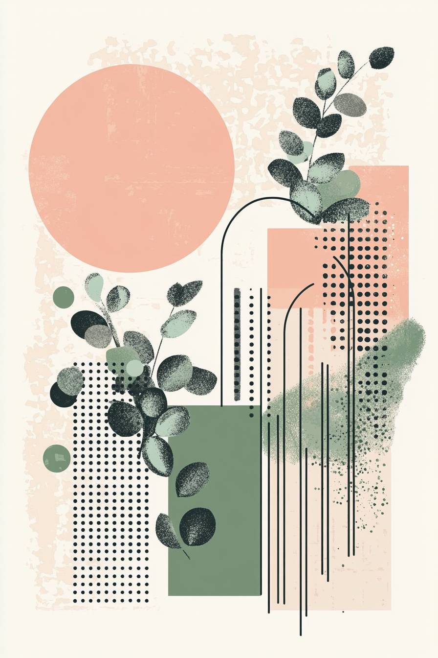 柔らかいパステルカラーの背景に、幾何学的な形、ボヘミアンパターン、ユーカリの葉、ドット、ライン、アーチがすべてエレガントに配置されています。デザインには、左側の大きな円形、中央右のピンクの楕円、および全体に散布された小さな緑の円形要素が含まれています。このプリントは、現代的でありながら温かみのある美しさを空間に提供し、ホームデコやインテリア装飾に最適です。