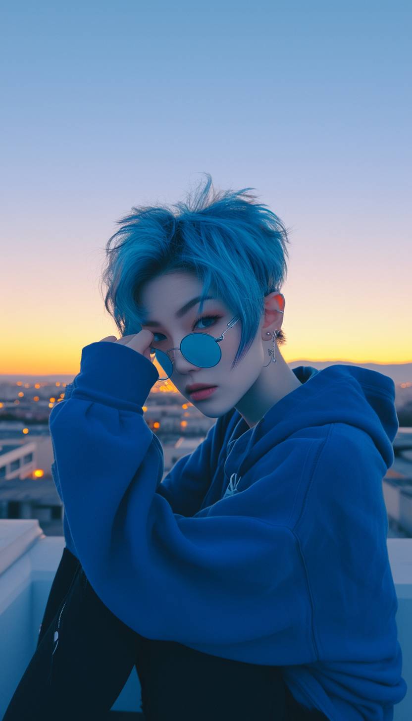 青い髪のインスタグラムモデルが青いフーディーと青いサングラスを着用し、強く、短髪で屋上にいる、ブルーアワーの中。