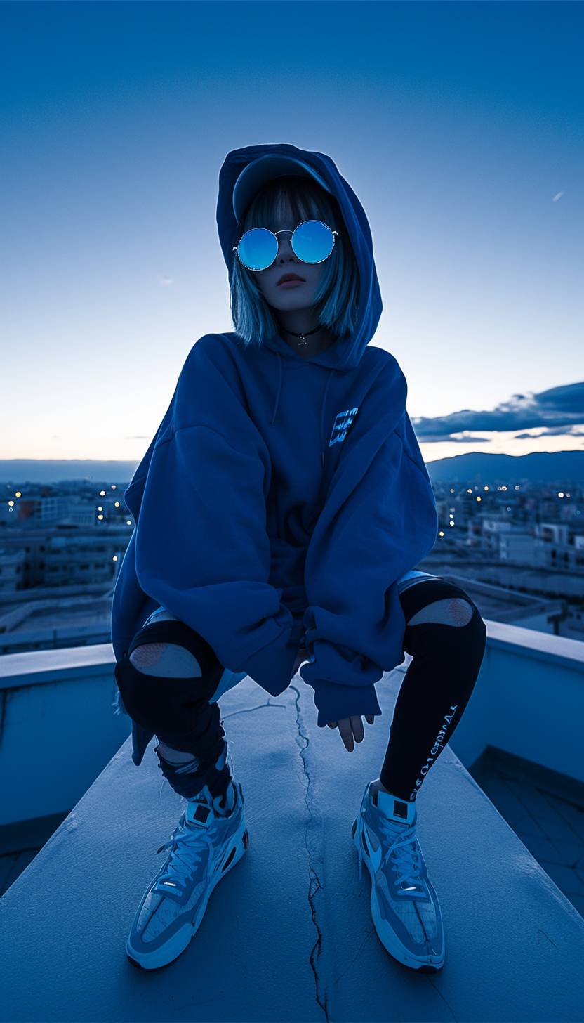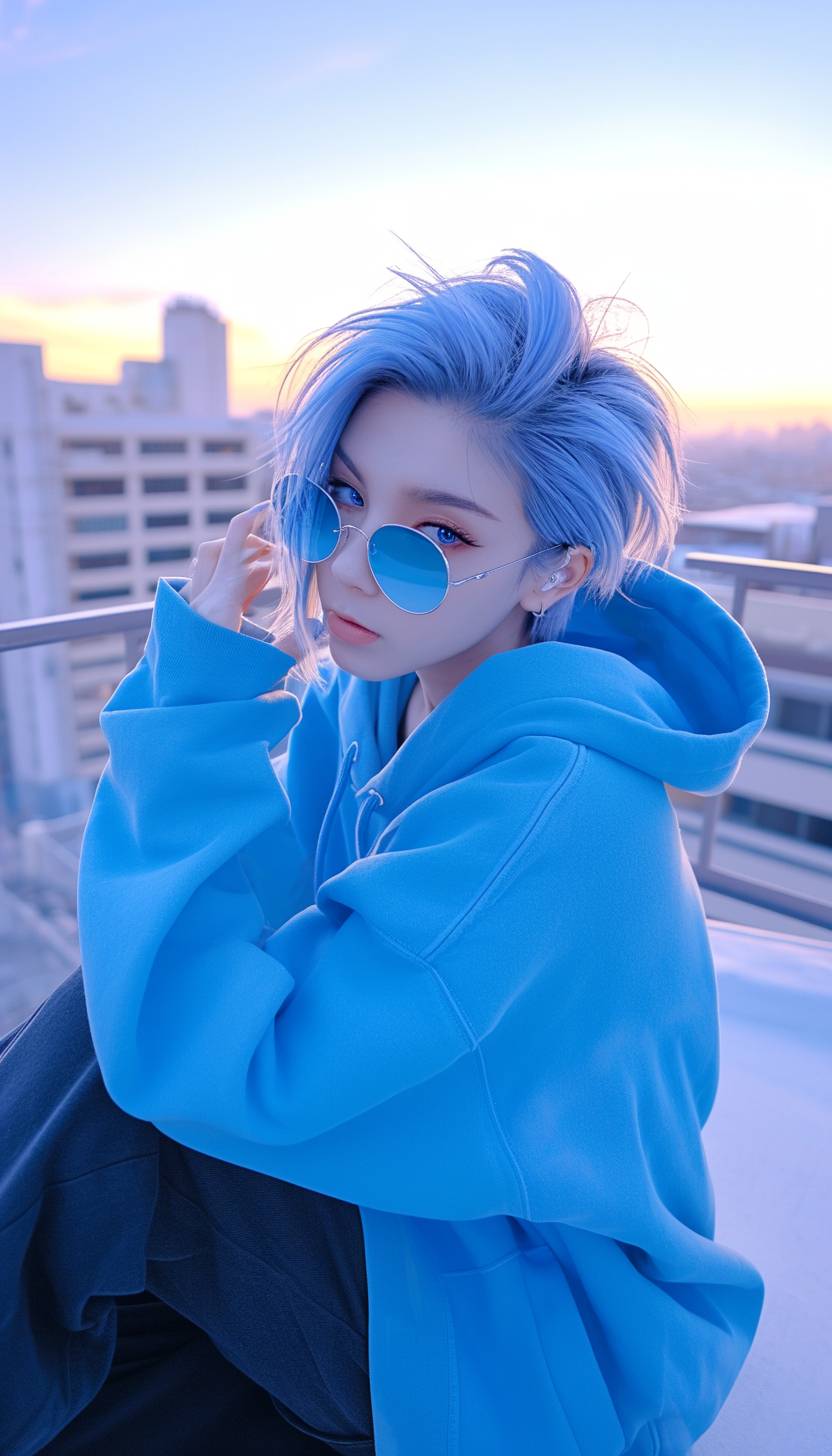 a photo of a blue hair instagram model, she is wearing blue hoodie, she is strong, she is wearing blue sunglasses, she is on a rooftop , blue hour, short hair --ar 4:7 --style raw --niji 6