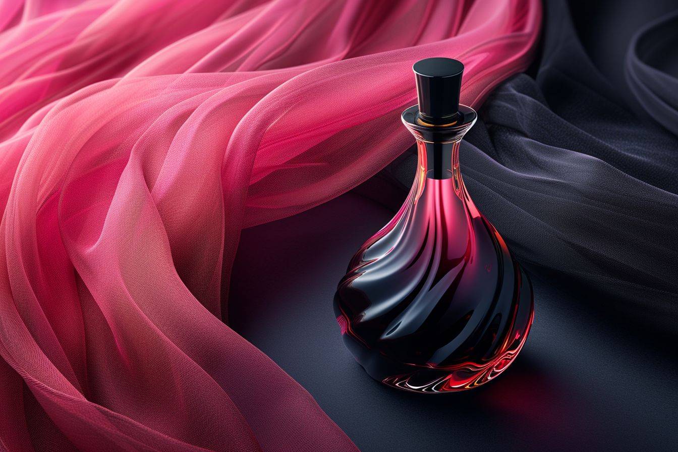 高級製品のボトル、流れるライン、黒とピンク、マクロ製品写真、モックアップ。