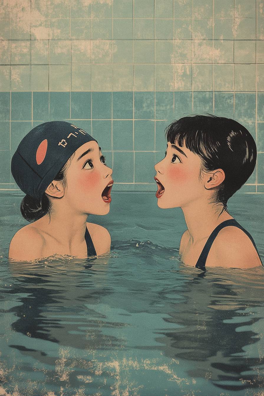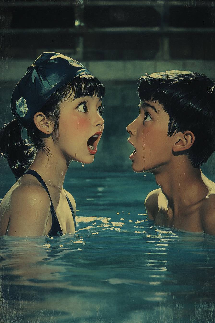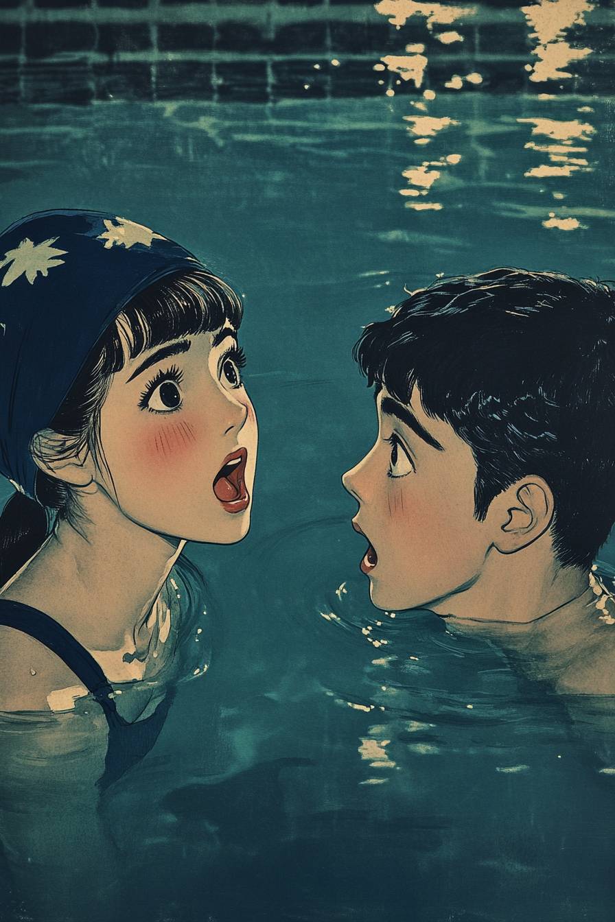 Full side view image, two Japanese 15-year-old in a dark swimming pool looking at each other with surprised faces, the water is their chest level, the girl is tall and is wearing a navy blue swimming cap and suit, and the boy is shorter than the girl, vintage illustrations, 1960 illustration --ar 2:3 --v 6.1