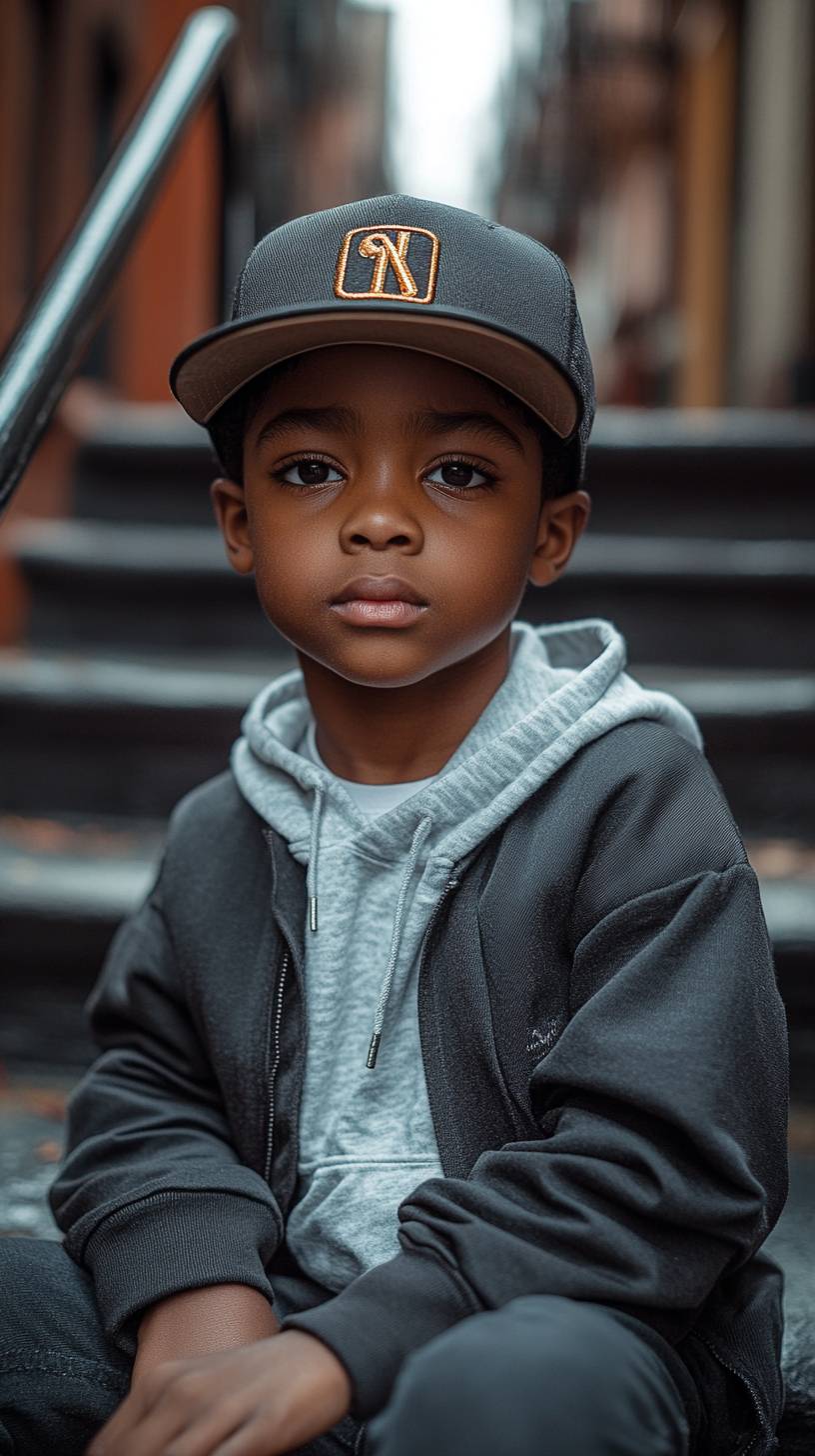 ドミニカの少年がボールキャップをかぶり、褐色の石段に座って悲しそうに見える。