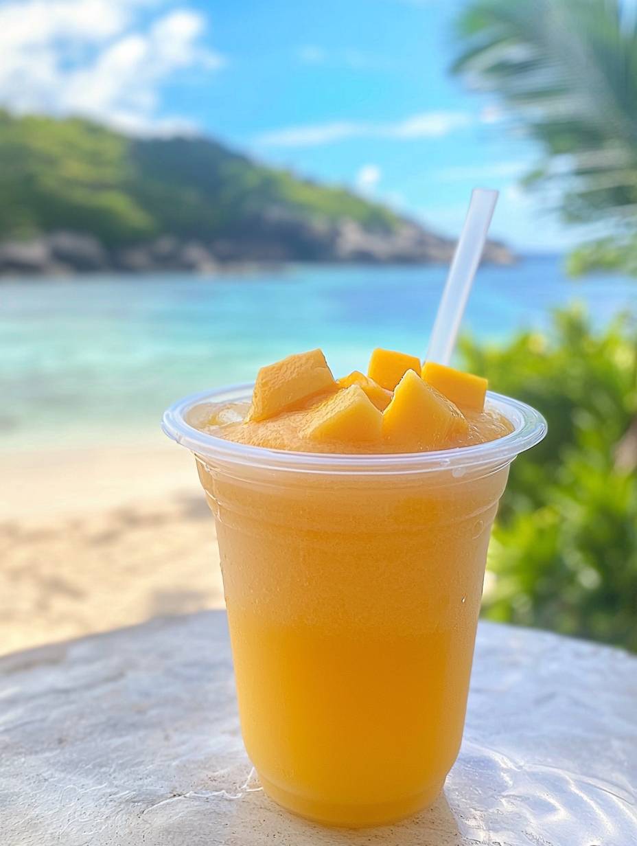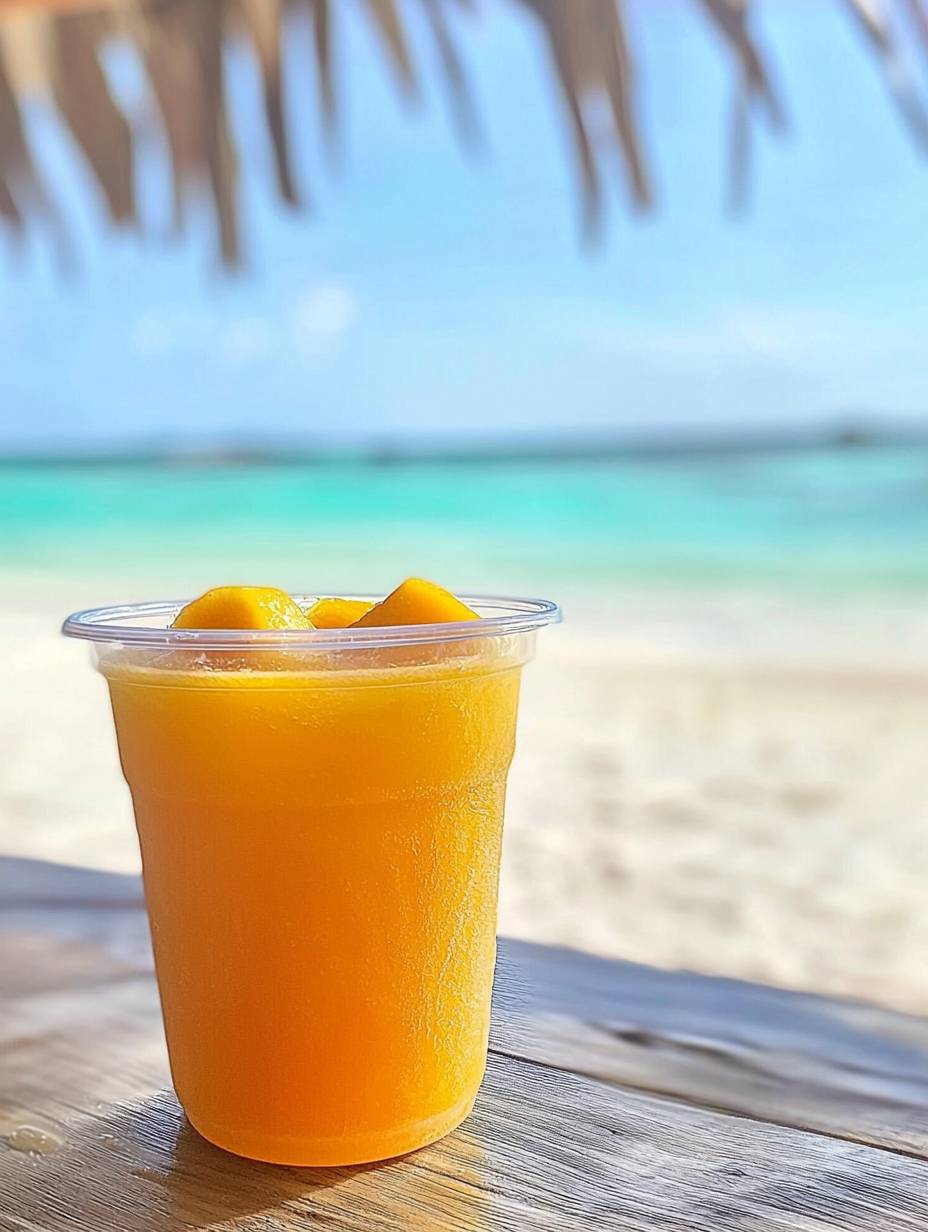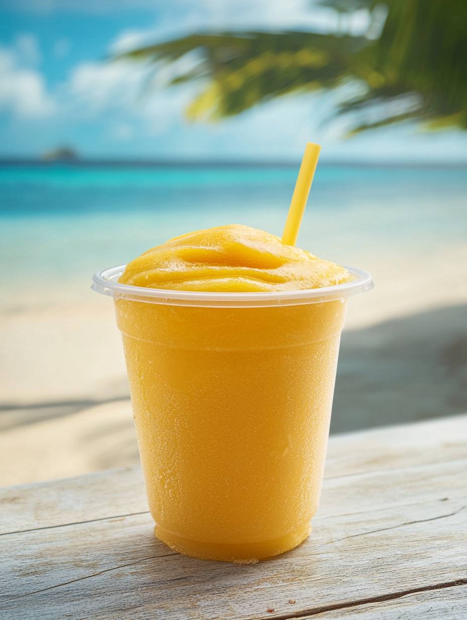 appetizing frozen mango lemonade on a transparent plastic glass with a tropical beach on the background --ar 3:4 --quality 2 --style raw --stylize 50 --v 6.1